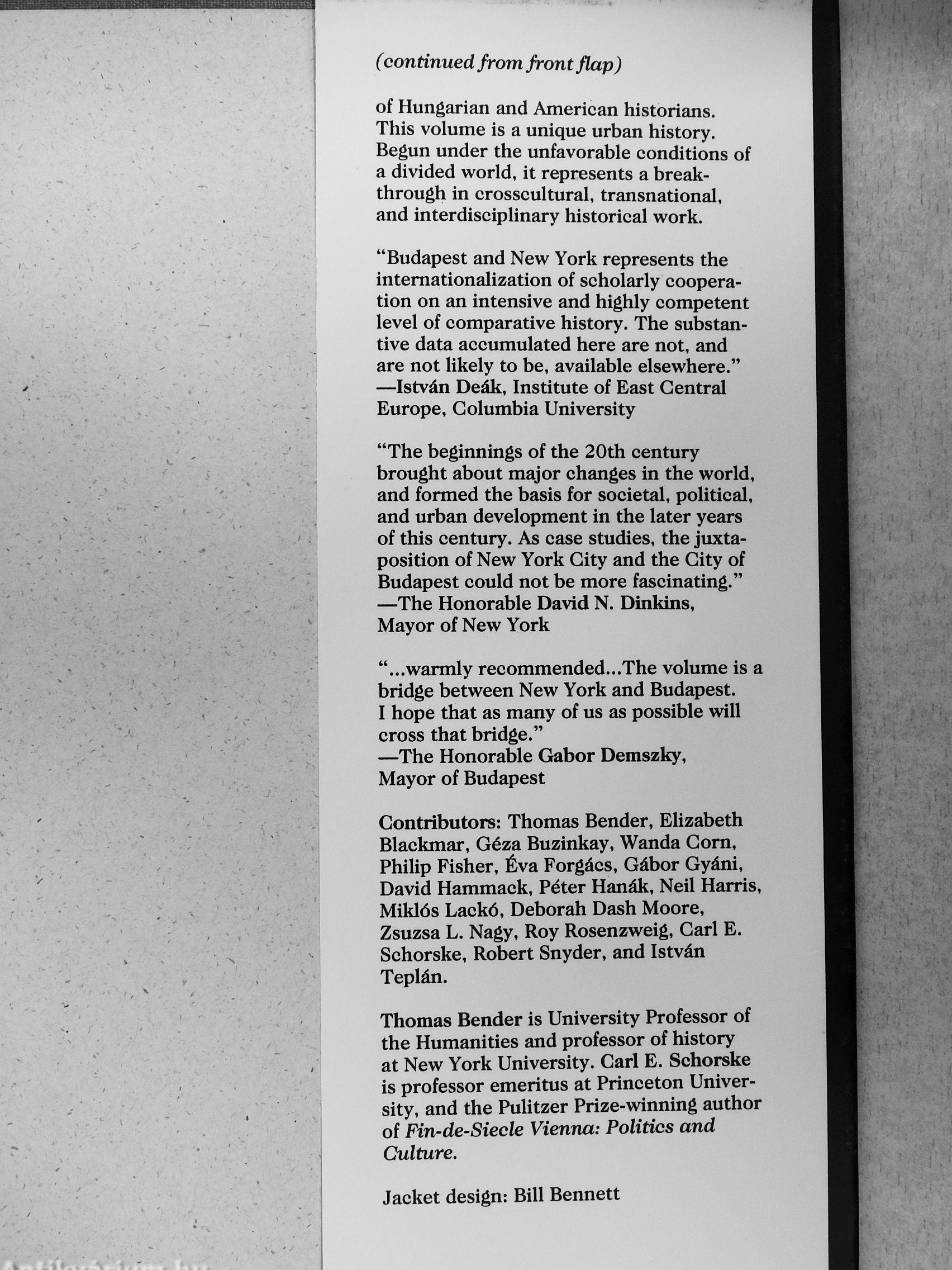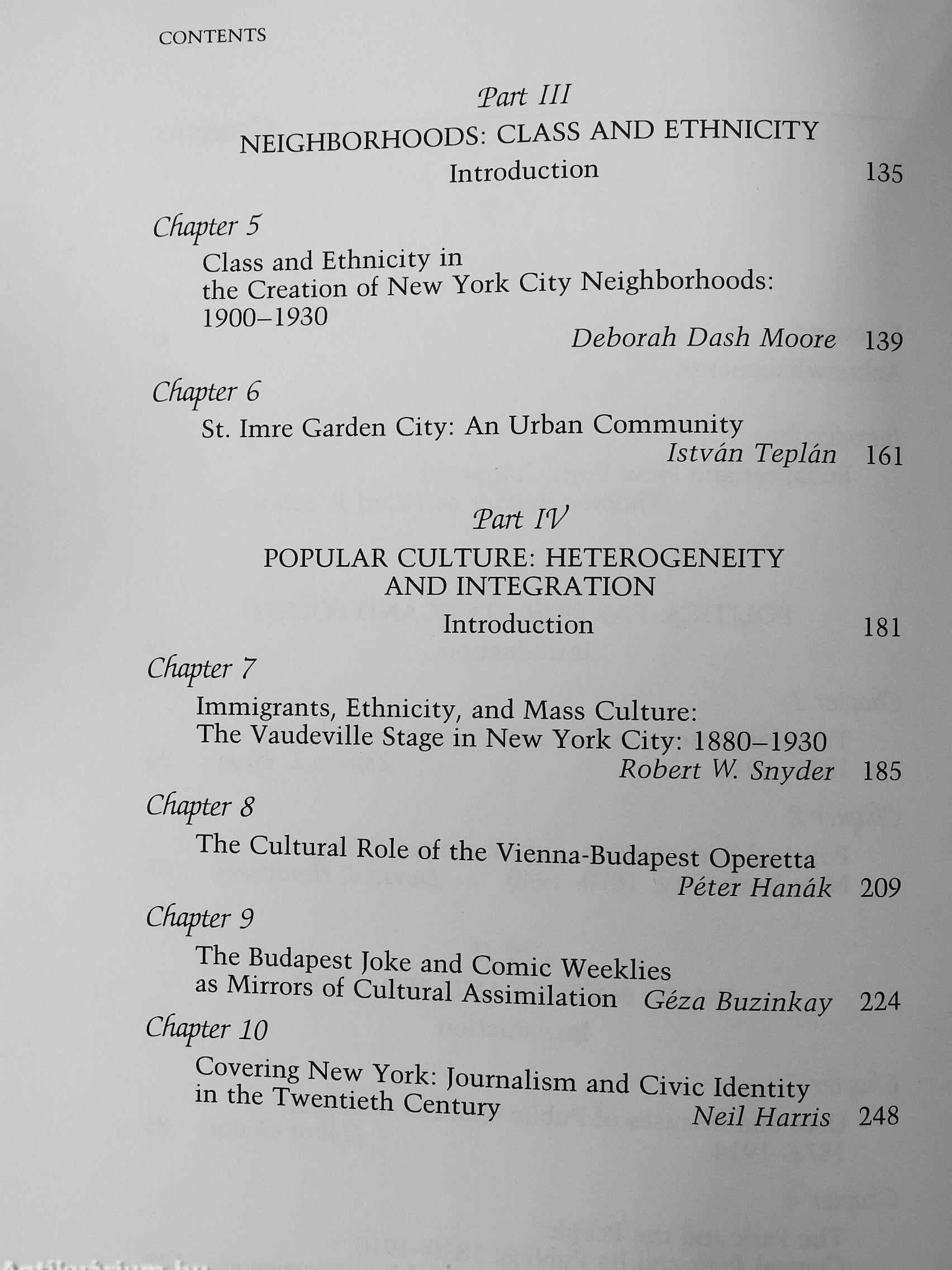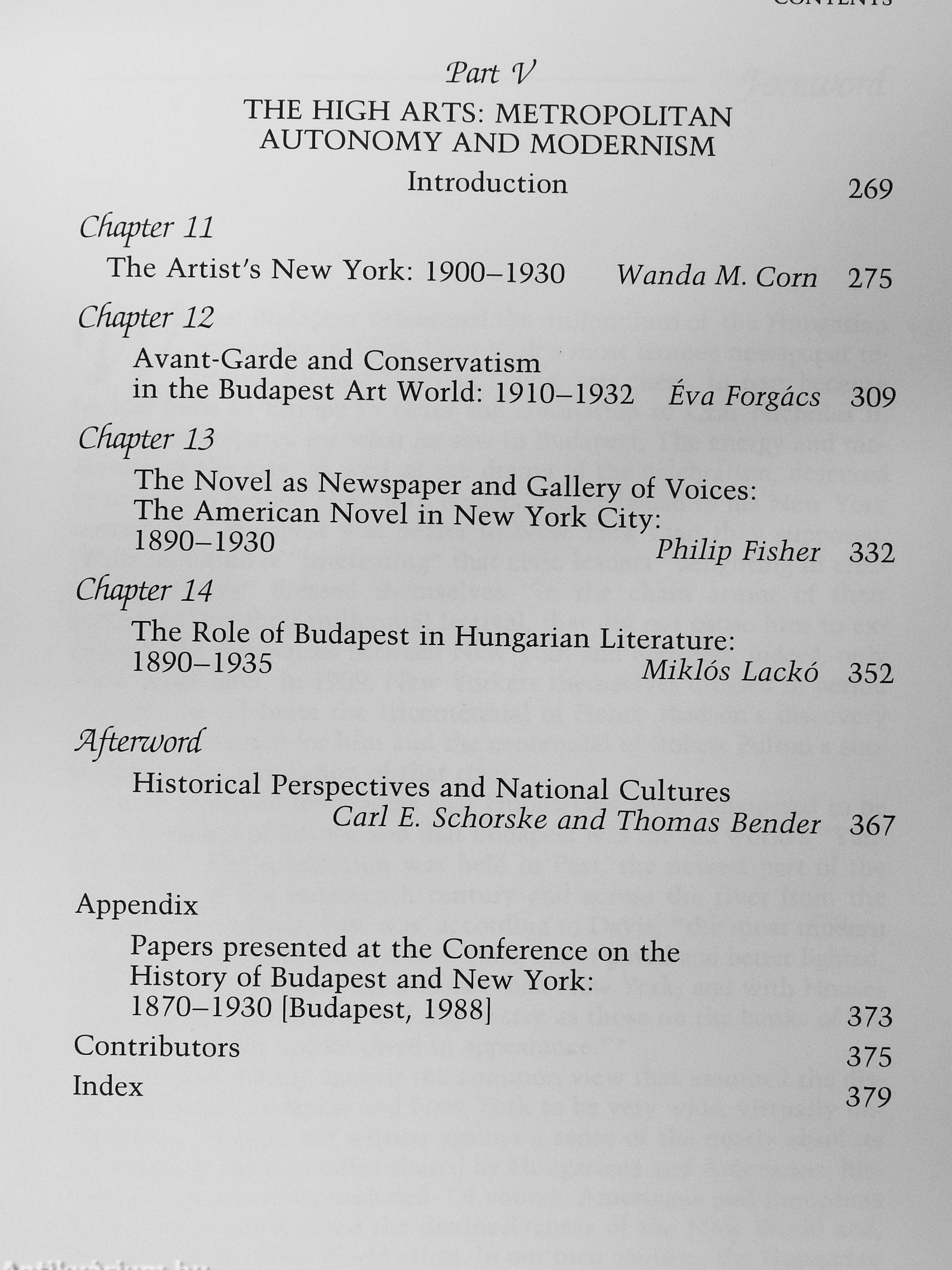 Contributors: Thomas Bender, Elizabeth Blackmar, Géza Buzinkay, Wanda Corn, Philip Fisher, Éva Forgáes, Gábor Gyáni, David Hammaek, Péter Hanák, Neil Harris, Miklós Laekó, Deborah Dash Moore, Zsuzsa L. Nagy, Roy Rosenzweig, Cari E. Schorske, Robert Snyder, and István Teplán.