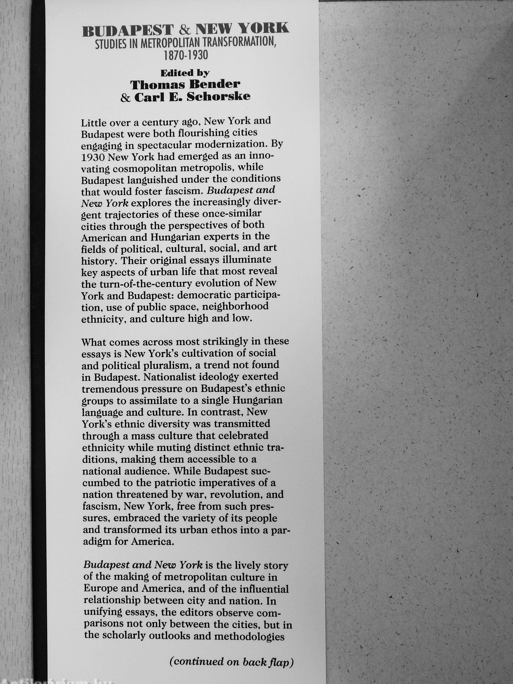 of the world s greatest cities become more comprehensible and appealing in the pages of Budapest and New York. Thomas Bender and Carl Schorske have assembled a remarkable cast of American and Hungarian authorities to explore the city along the Hudson and the city straddling the Danube, from the late 19th through the first half of the 20th century. This book is a model of the new urban history, edited and integrated by two great masters of the art, and a sign of hope for collaborative history across boundaries of nation and historiographical tradition.^