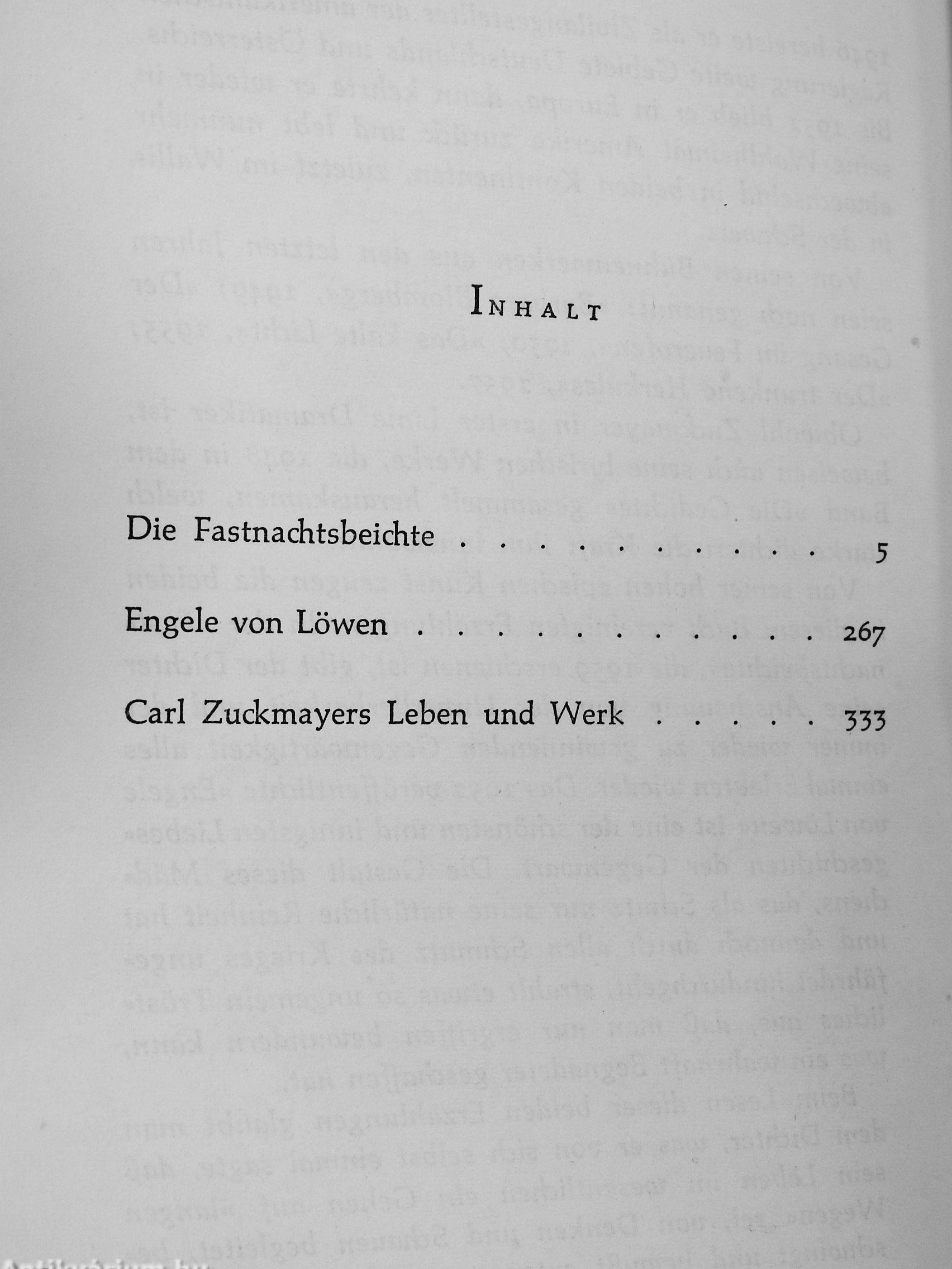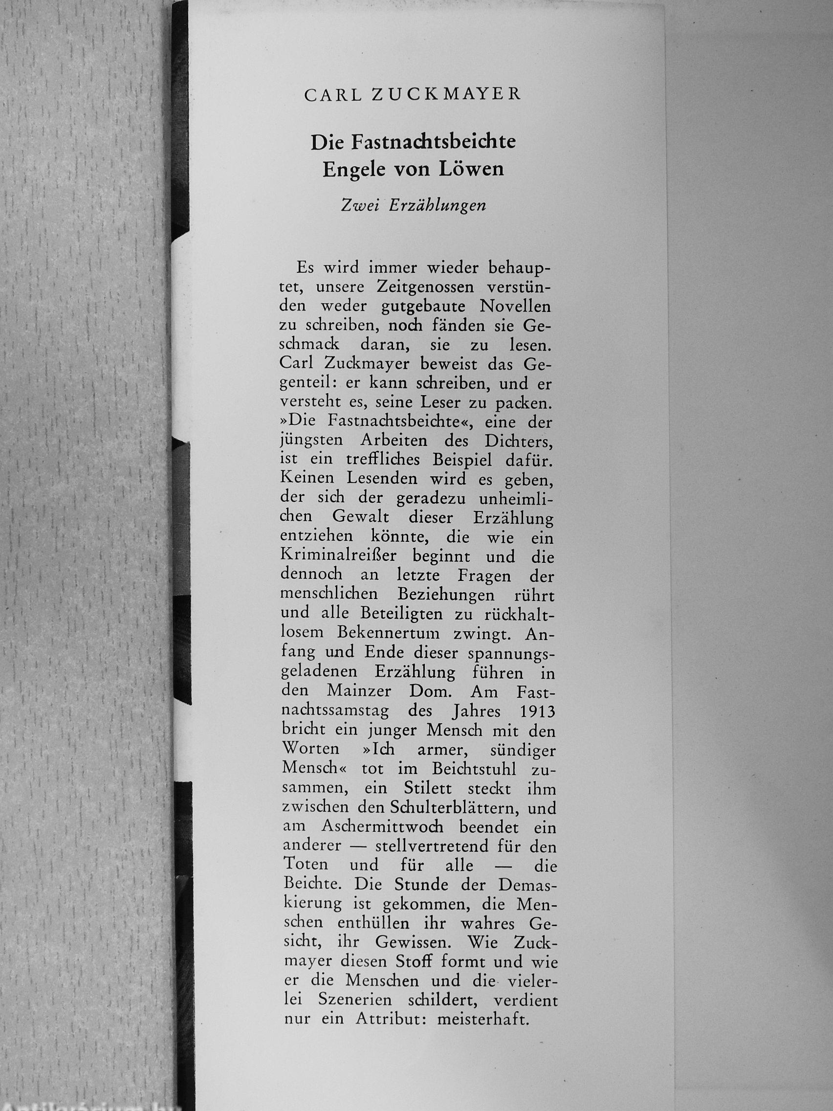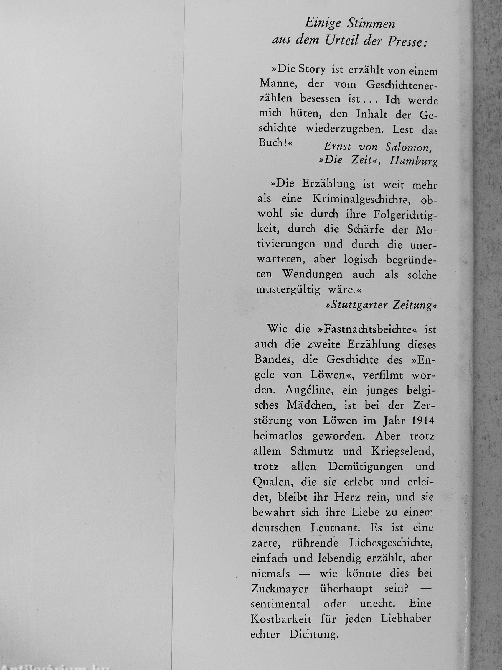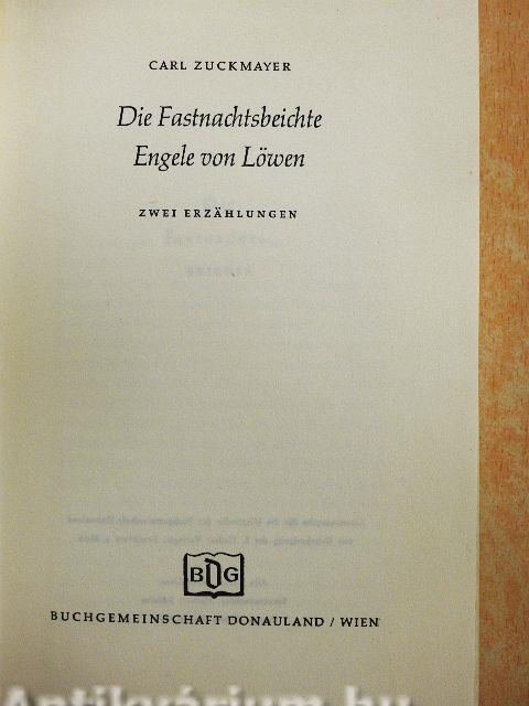Wie die »Fastnachtsbeichte« ist auch die zweite Erzählung dieses Bandes, die Geschichte des »En-gele von Löwen«, verfilmt worden. Angeline, ein junges belgisches Mädchen, ist bei der Zerstörung von Löwen im Jahr 1914 heimatlos geworden. Aber trotz allem Schmutz und Kriegselend, trotz allen Demütigungen und Qualen, die sie erlebt und erleidet, bleibt ihr Herz rein, und sie bewahrt sich ihre Liebe zu einem deutschen Leutnant. Es ist eine zarte, rührende Liebesgeschichte, einfach und lebendig erzählt, aber niemals — wie könnte dies bei Zuckmayer überhaupt sein? — sentimental oder unecht. Eine Kostbarkeit für jeden Liebhaber echter Dichtung.