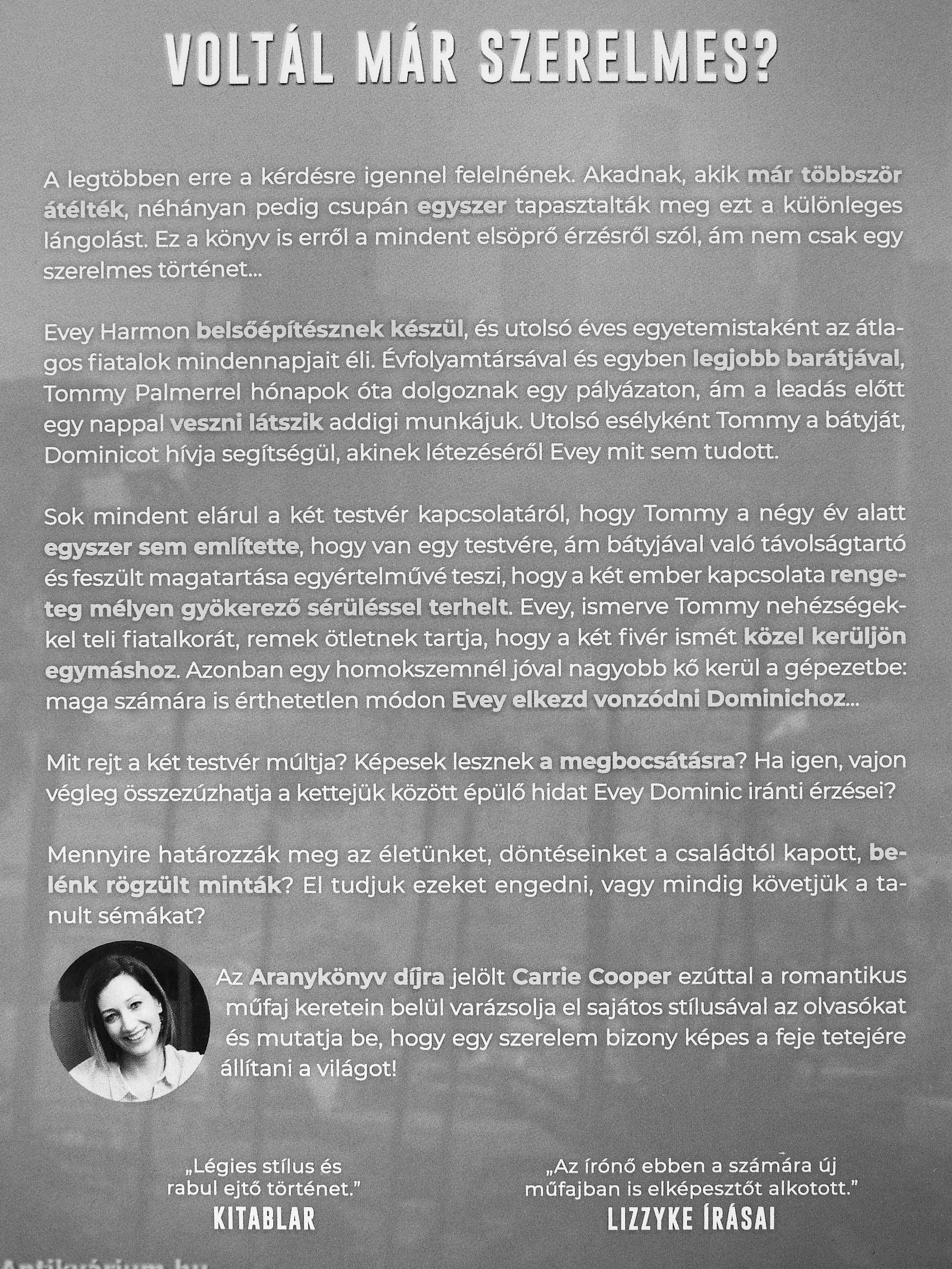Az Aranykönyv dQra jelölt Carrie Cooper ezúttal a romantikus , műfaj keretein belül varázsolja el sajátos stílusával az olvasókat és mutatja be, hogy egy szerelem bizony képes a feje tetejére állítani a világot!