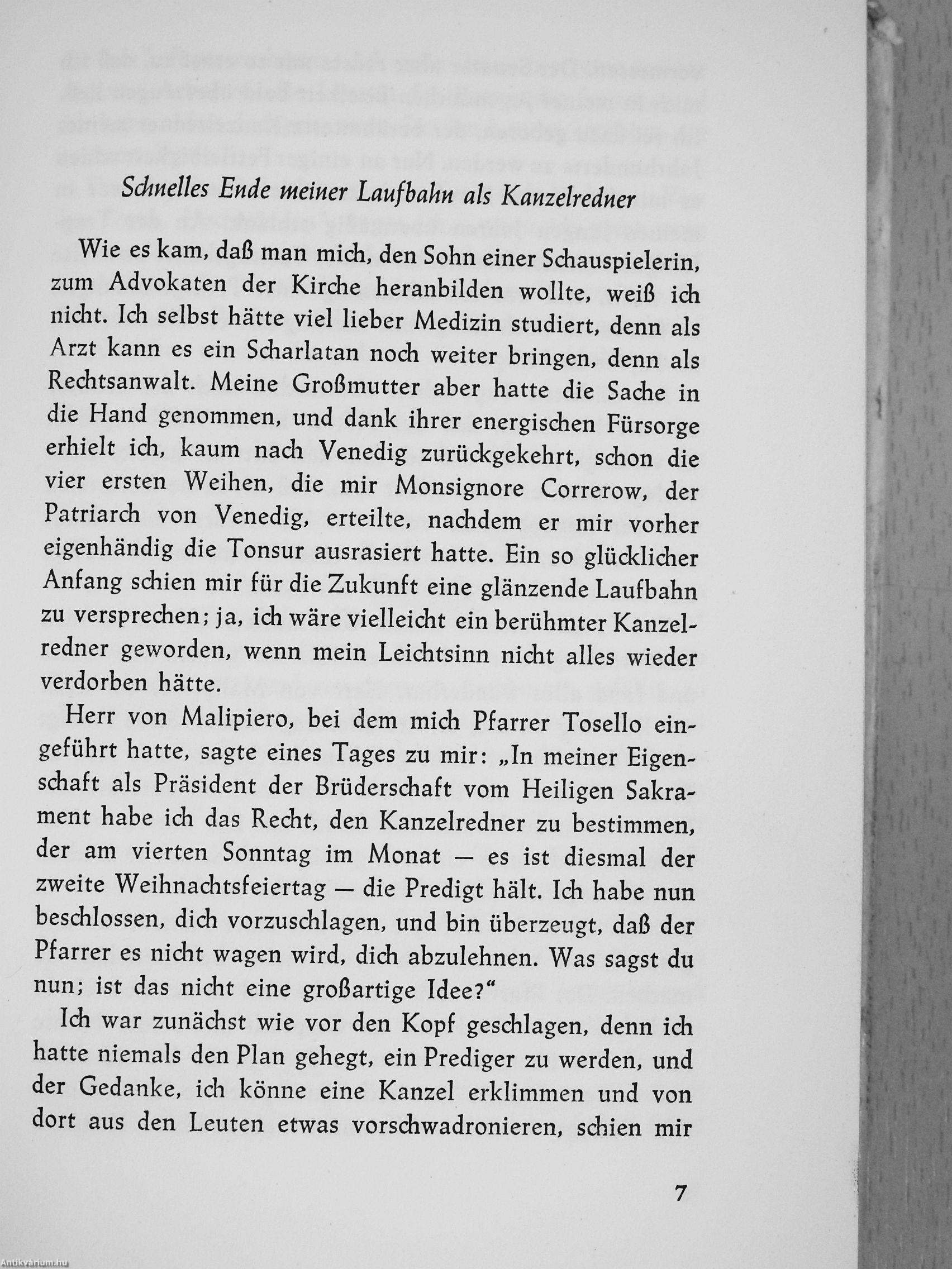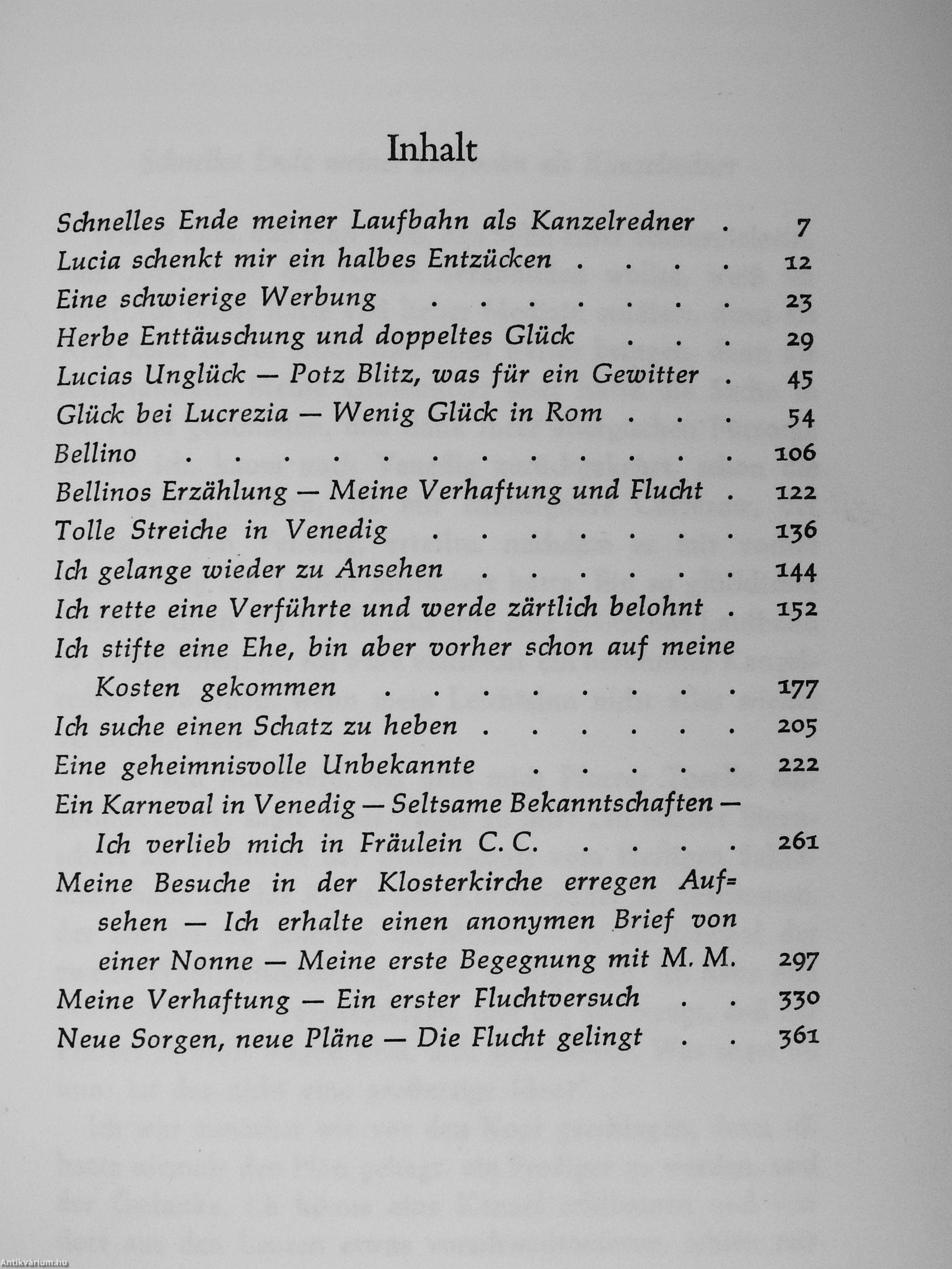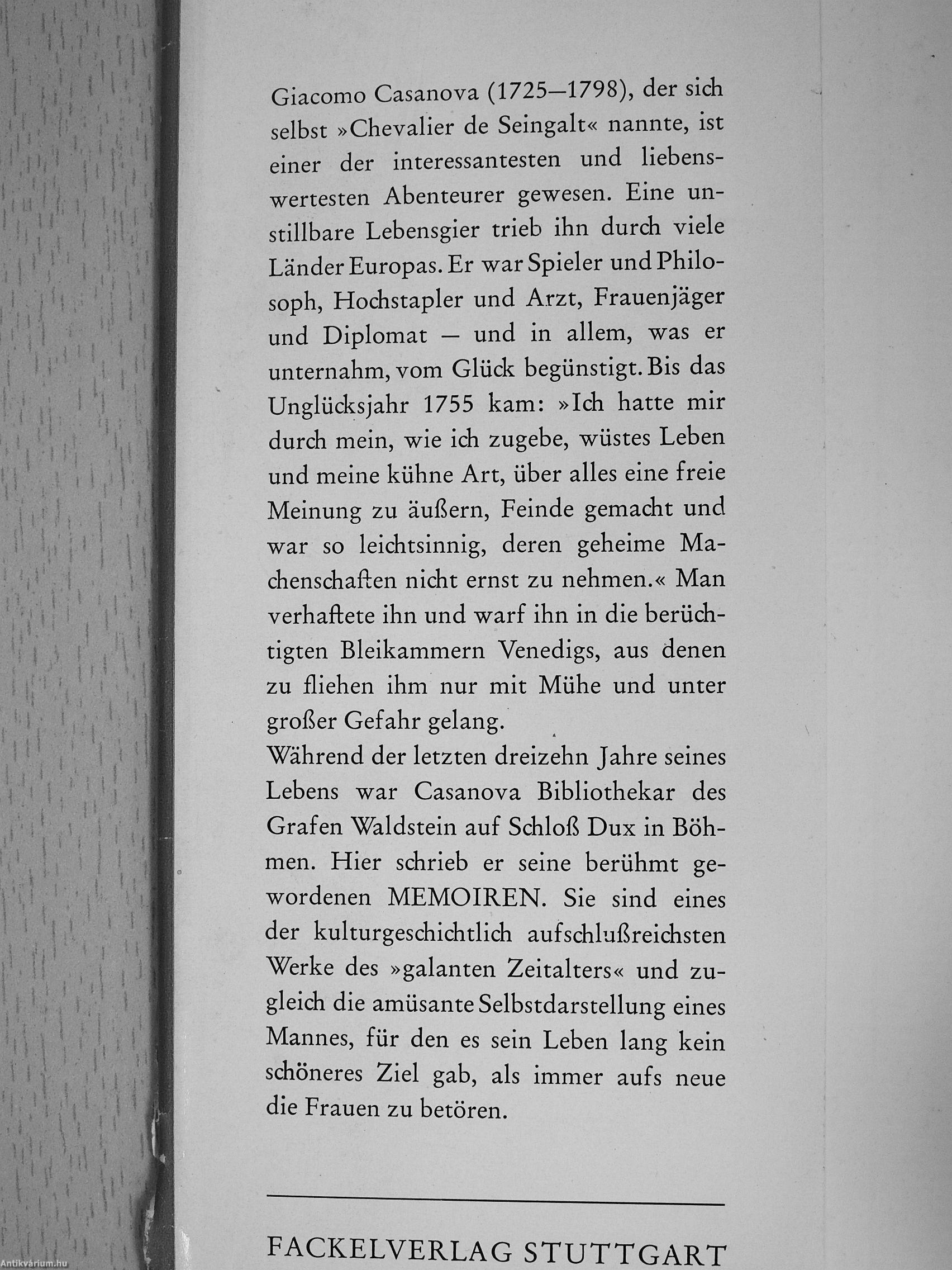 Giacomo Casanova (1725—1798), der sich selbst »Chevalier de Seingalt« nannte, ist einer der interessantesten und liebenswertesten Abenteurer gewesen. Eine unstillbare Lebensgier trieb ihn durch viele Länder Europas. Er war Spieler und Philosoph, Hochstapler und Arzt, Frauenjäger und Diplomat — und in allem, was er unternahm, vom Glück begünstigt. Bis das Unglücksjahr 1755 kam: »Ich hatte mir durch mein, wie ich zugebe, wüstes Leben und meine kühne Art, über alles eine freie Meinung zu äußern, Feinde gemacht und war so leichtsinnig, deren geheime Machenschaften nicht ernst zu nehmen.« Man verhaftete ihn und warf ihn in die berüchtigten Bleikammern Venedigs, aus denen zu fliehen ihm nur mit Mühe und unter großer Gefahr gelang. Während der letzten dreizehn Jahre seines Lebens war Casanova Bibliothekar des Grafen "Waldstein auf Schloß Dux in Böhmen. Hier schrieb er seine berühmt gewordenen MEMOIREN. Sie sind eines der kulturgeschichtlich aufschlußreichsten Werke des »galanten... Tovább