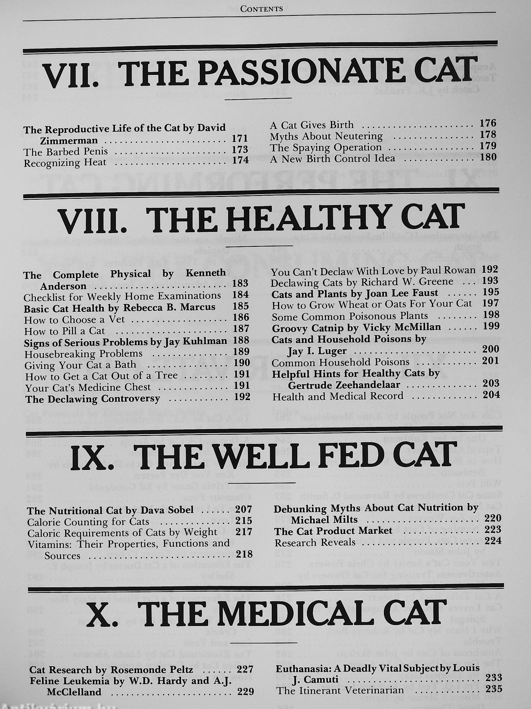 weekly examination and prevent health problems; how to help your cat deliver her kittens; whether or not to neuter or spay The declawing controversy is finally spelled out clearly. Plus advice on how to travel with your cat; how to leave it a legacy; how to enter it in a cat show; which household products and which common plants can poison your cat; how to give your cat acupuncture massage; and how to live sanely with 12 (or more) cats.