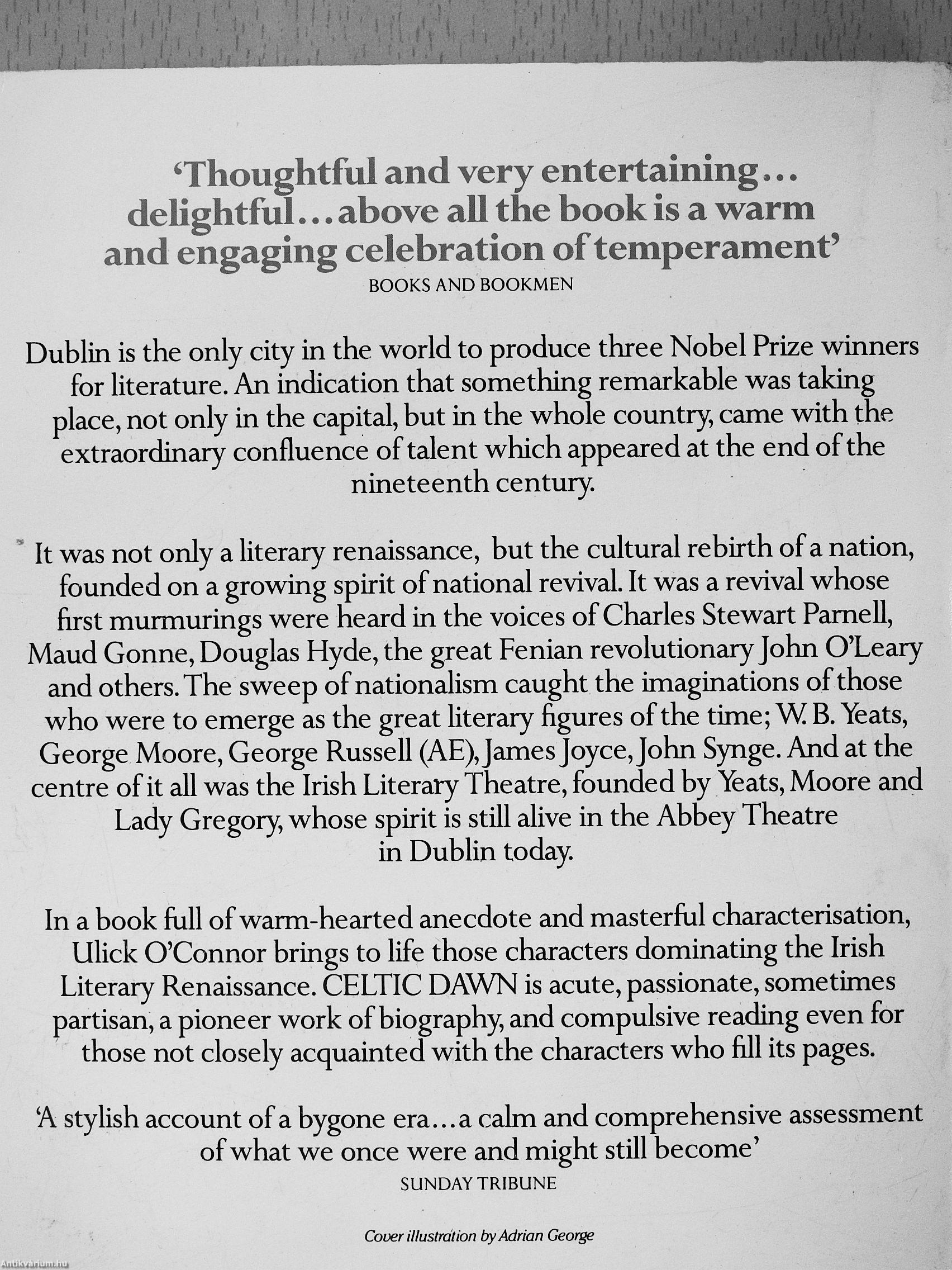 In a book fiill of warm-hearted anecdote and masterfiil characterisation, Ulick O'Connor brings to life those characters dominating the Irish Literary Renaissance. CELTIC DAWN is acute, passionate, sometimes partisan, a pioneer work of biography, and compulsive reading even for those not closely acquainted with the characters who fill its pages.