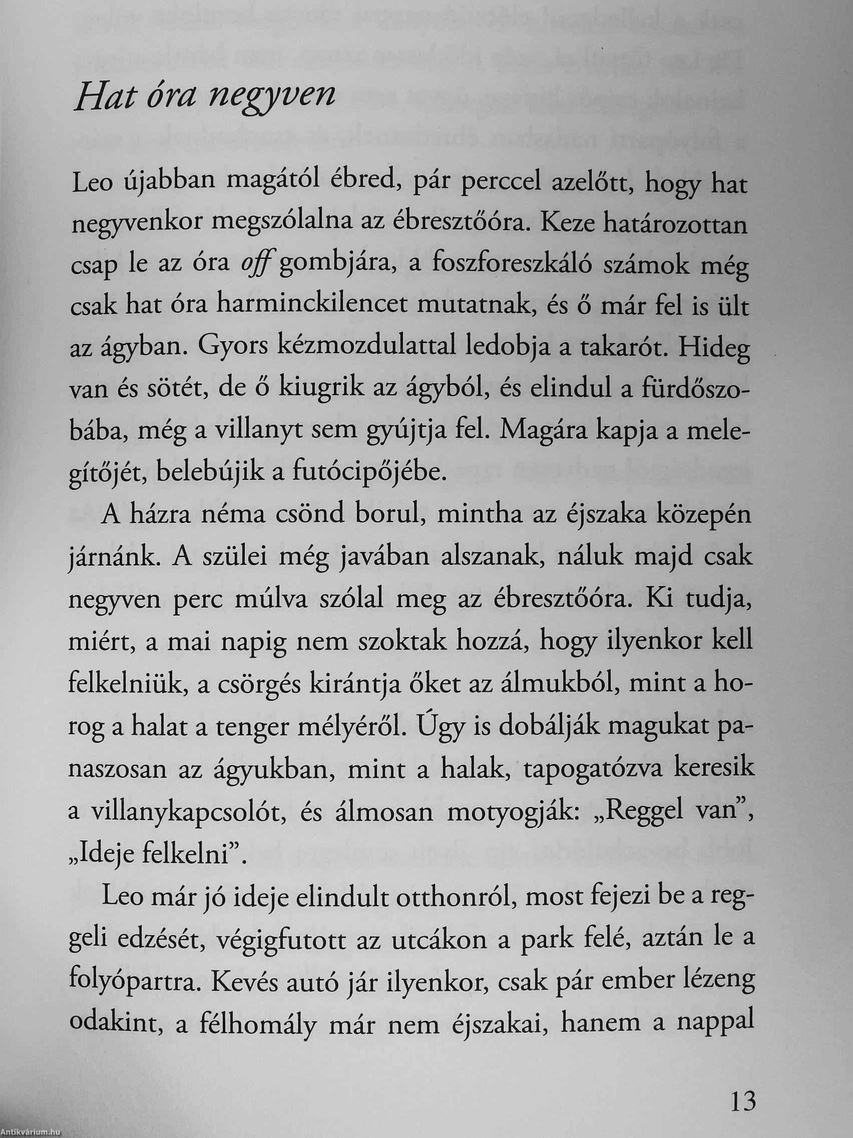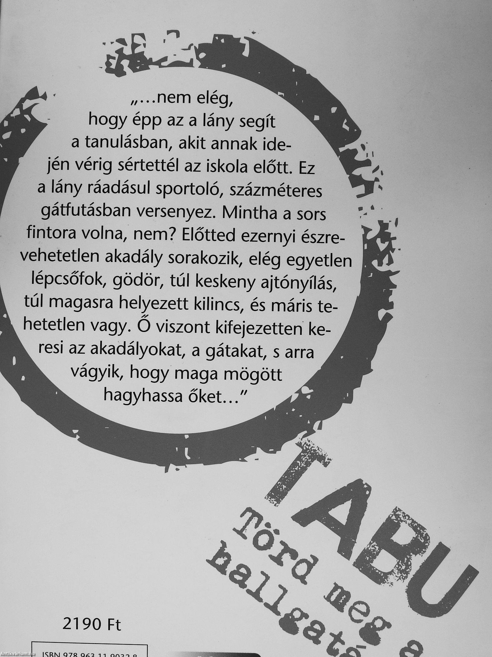 „ nem elég, Aj^ hogy épp az a lány segít ífl^ a tanulásban, akit annak ide-^^ jén vérig sértettél az iskola előtt. Ez F a lány ráadásul sportoló, százméteres r gátfutásban versenyez. Mintha a sors fintora volna, nem? Előtted ezernyi észrevehetetlen akadály sorakozik, elég egyetlen lépcsőfok, gödör, túl keskeny ajtónyílás, túl magasra helyezett kilincs, és máris tehetetlen vagy. Ő viszont kifejezetten keresi az akadályokat, a gátakat, s arra vágyik, hogy maga mögött hagyhassa őket ''