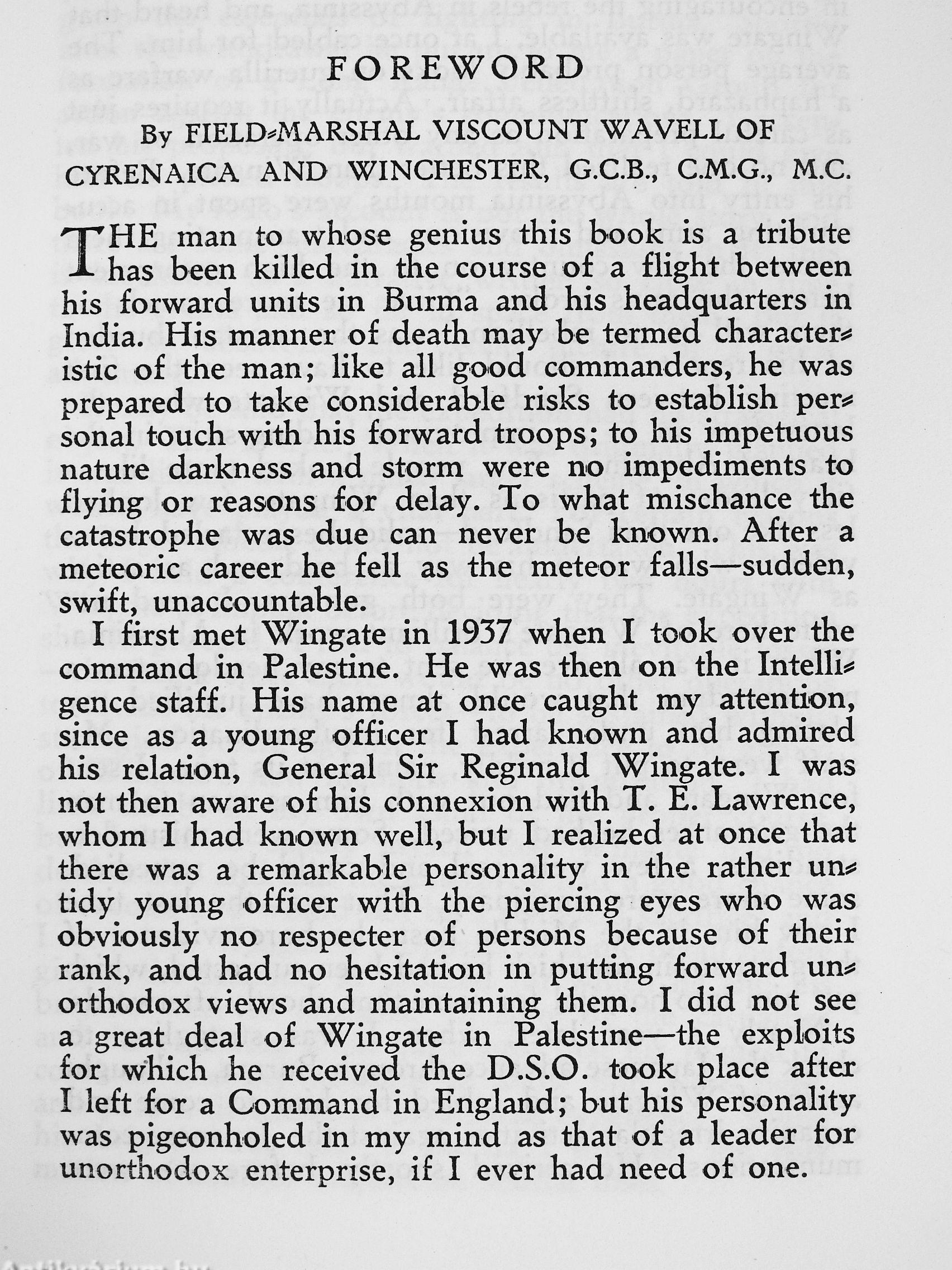 Had it not been for Viscount Wavell's flair for selecting the right man the seemingly mad and impossible feat of conducting irregular activities behind the Japanese lines in Burma in 19+2 would never have been undertaken. As it was, Orde Charles Wingate's eccentric genius and brilliant organisation achieved the impossible, and his few hundred Chindits—ragged, exhausted and suffering—returned to Imphal having traversed over one thousand miles of dense jungle, crossed high mountain ranges and deep rivers, and thoroughly worsted the Japanese army.