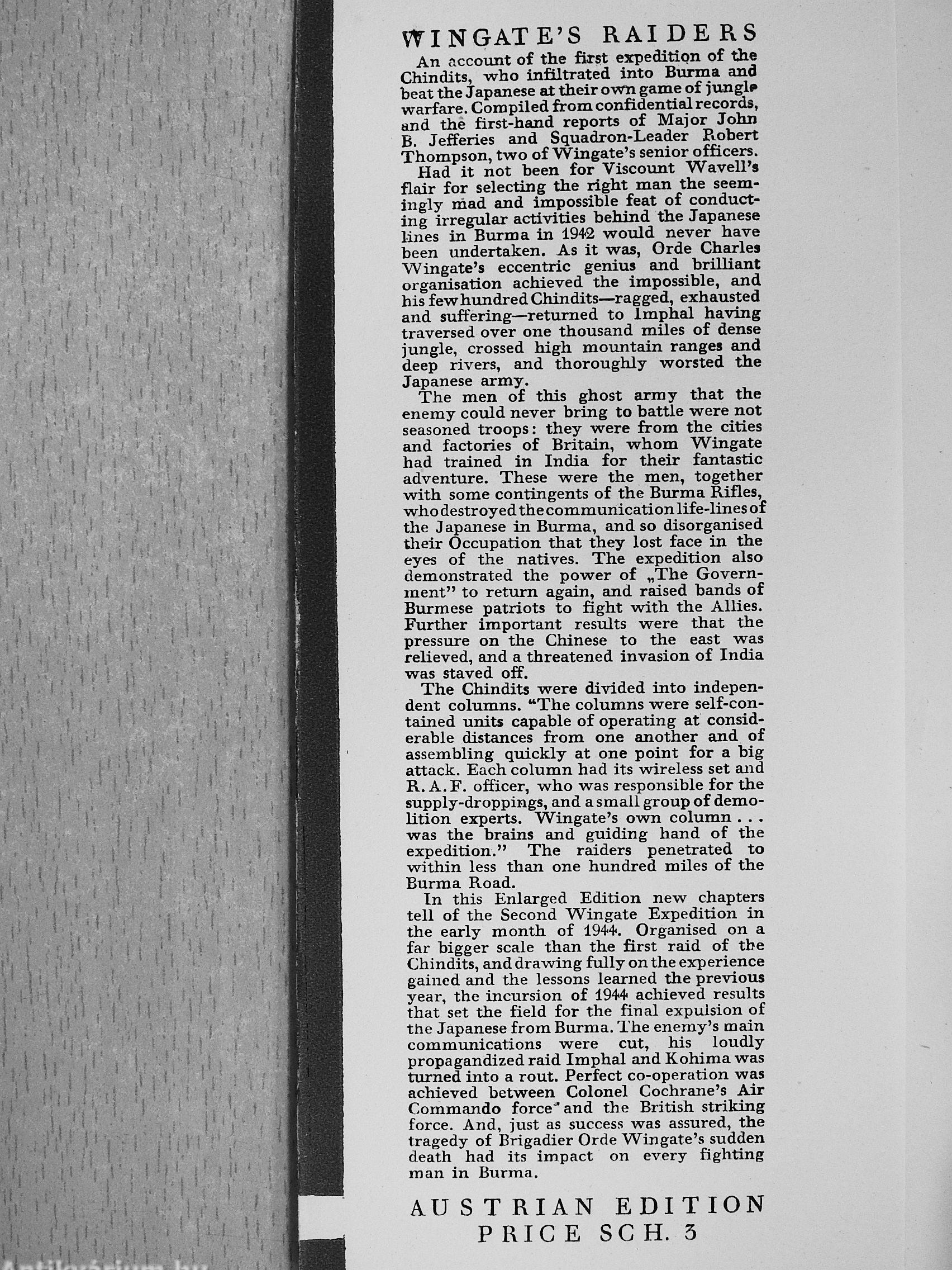 In this Enlarged Edition new chapters tell of the Second Wingate Expedition in the early month of 1944-. Organised on a far bigger scale than the first raid of the Chindits, and drawing fully on the experience gained and the lessons learned the previous year, the incursion of 1944 achieved results that set the field for the final expulsion of the Japanese from Burma. The enemy's main communications were cut, his loudly propagandized raid Imphal and Kohima was turned into a rout. Perfect co-operation was achieved between Colonel Cochrane's Air Commando force''and the British striking force. And, just as success was assured, the tragedy of Brigadier Orde Wingate's sudden death had its impact on every fighting man in Burma.