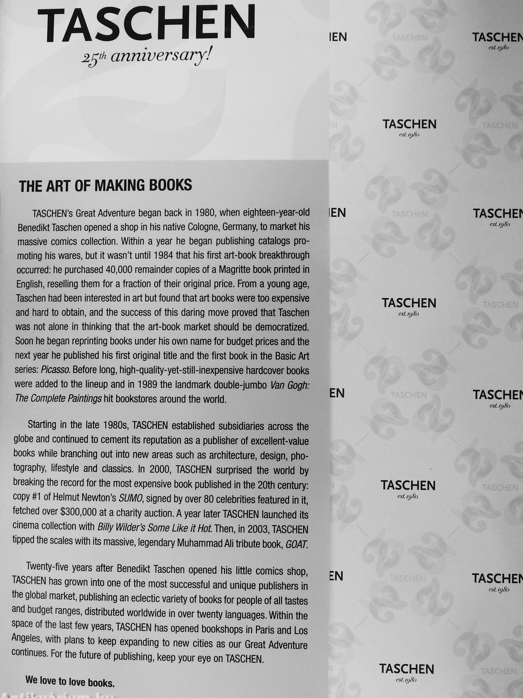 Twenty-five years after Benedikt Taschen opened his little comics shop, TASCHEN has grown into one of the most successful and unique publishers in the global market, publishing an eclectic variety of books for people of all tastes and budget ranges, distributed worldwide in over twenty languages. Within the space of the last few years, TASCHEN has opened bookshops in Paris and Los Angeles, with plans to keep expanding to new cities as our Great Adventure continues. For the future of publishing, keep your eye on TASCHEN.