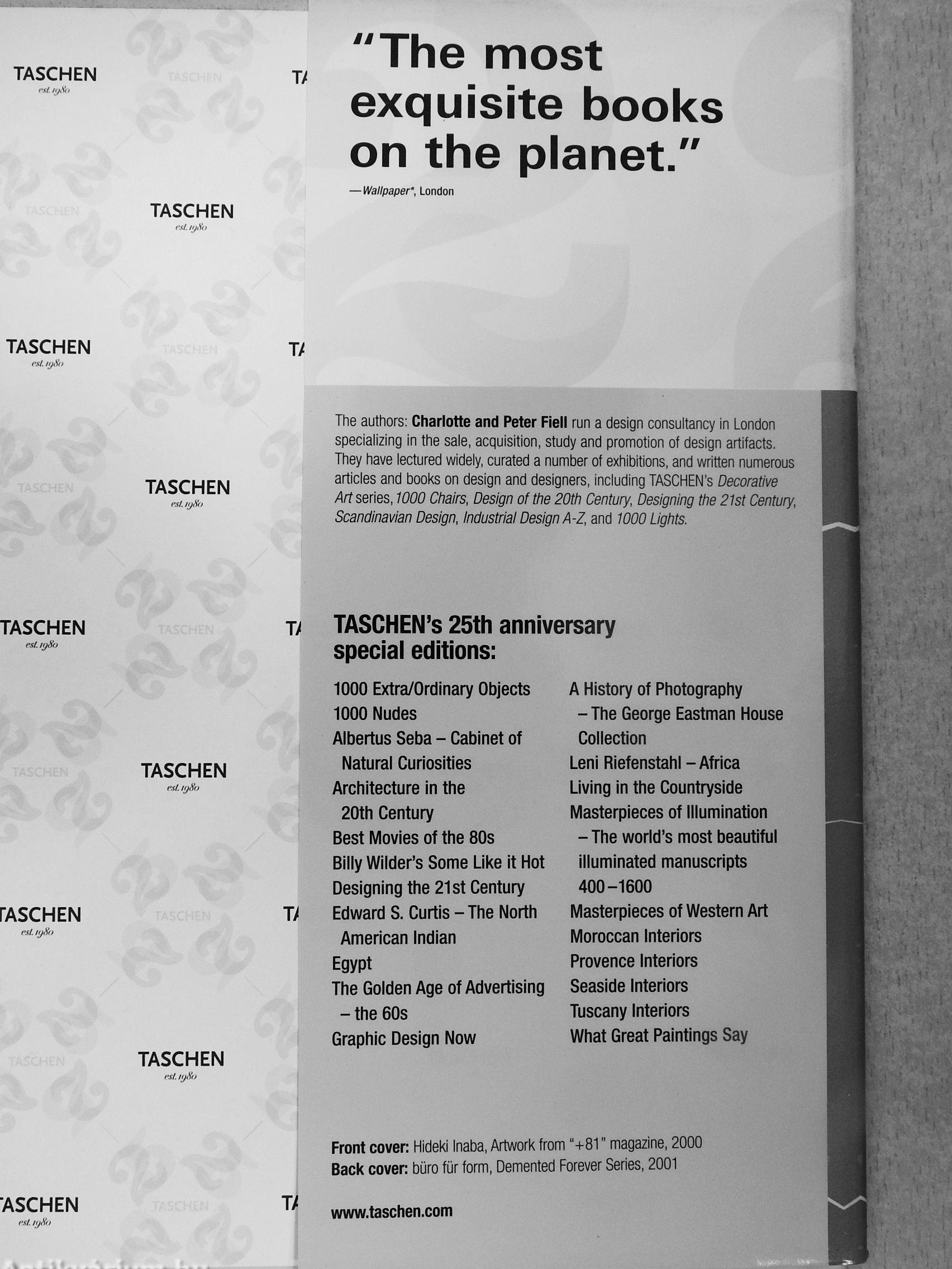 The authors: Charlotte and Peter Fiell run a design consultancy in London specializing in the sale, acquisition, study and promotion of design artifacts. They have lectured widely, curated a number of exhibitions, and written numerous articles and books on design and designers, including TASCHEN's Decorative Art series, 1000 Ctiairs, Design of the 20tt] Century, Designing ttie 21st Century, Scandinavian Design. Industrial Design A-Z, and 1000 Lights.