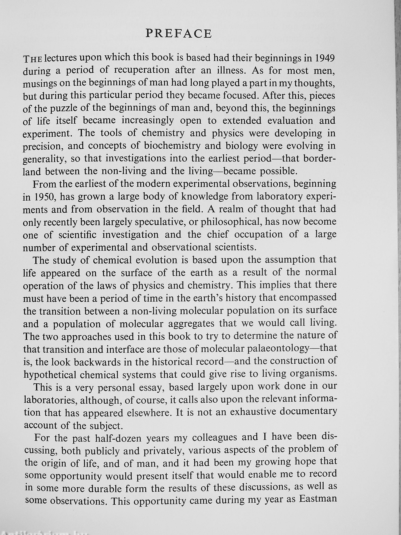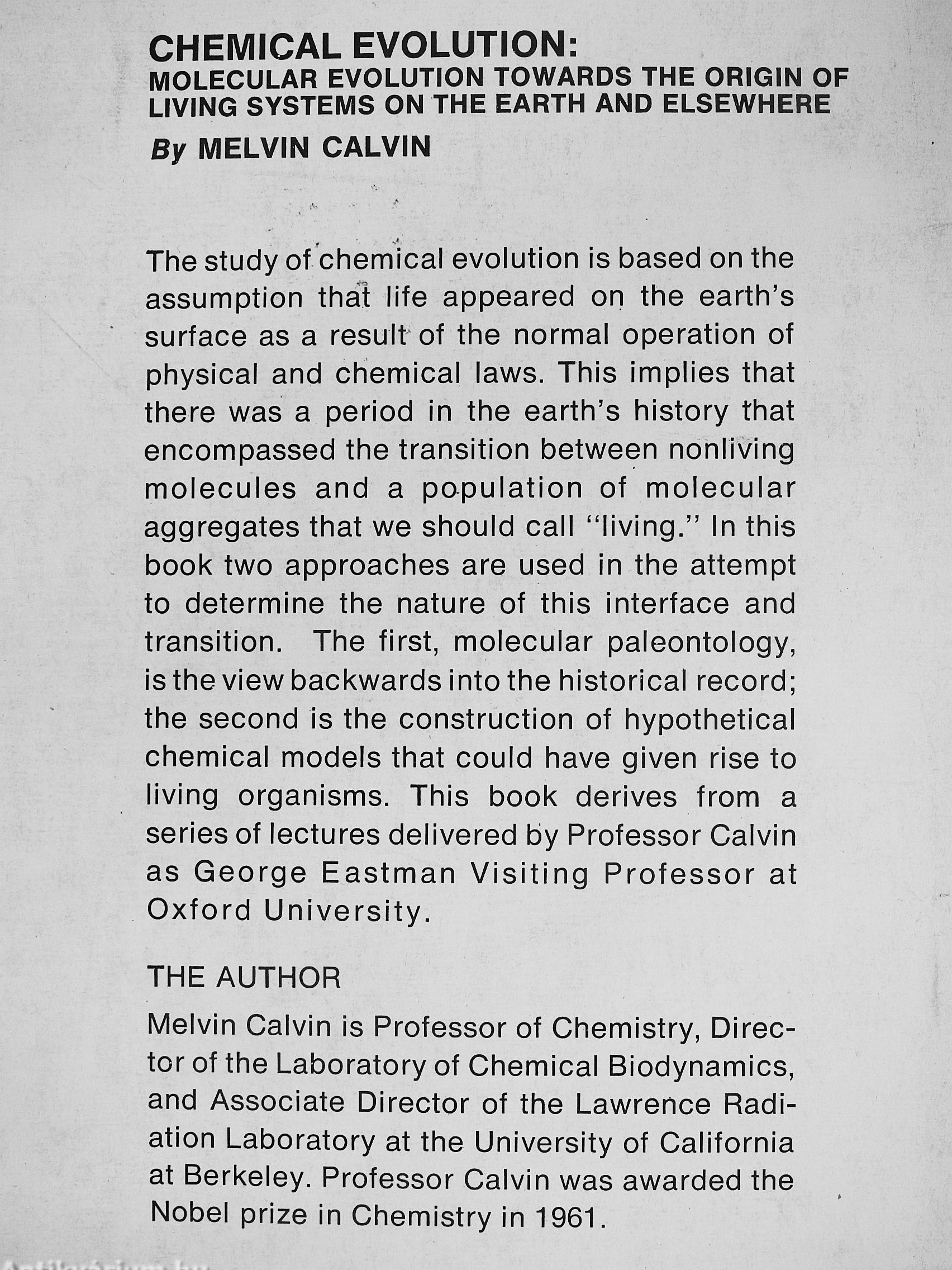 The study of chemical evolution is based on the assumption that life appeared on the earth's surface as a result of the normal operation of physical and chemical laws. This implies that there was a period in the earth's history that encompassed the transition between nonliving molecules and a population of molecular aggregates that we should call "living." In this book two approaches are used in the attempt to determine the nature of this interface and transition. The first, molecular paleontology, is the view backwards into the historical record; the second is the construction of hypothetical chemical models that could have given rise to living organisms. This book derives from a series of lectures delivered by Professor Calvin as George Eastman Visiting Professor at Oxford University.