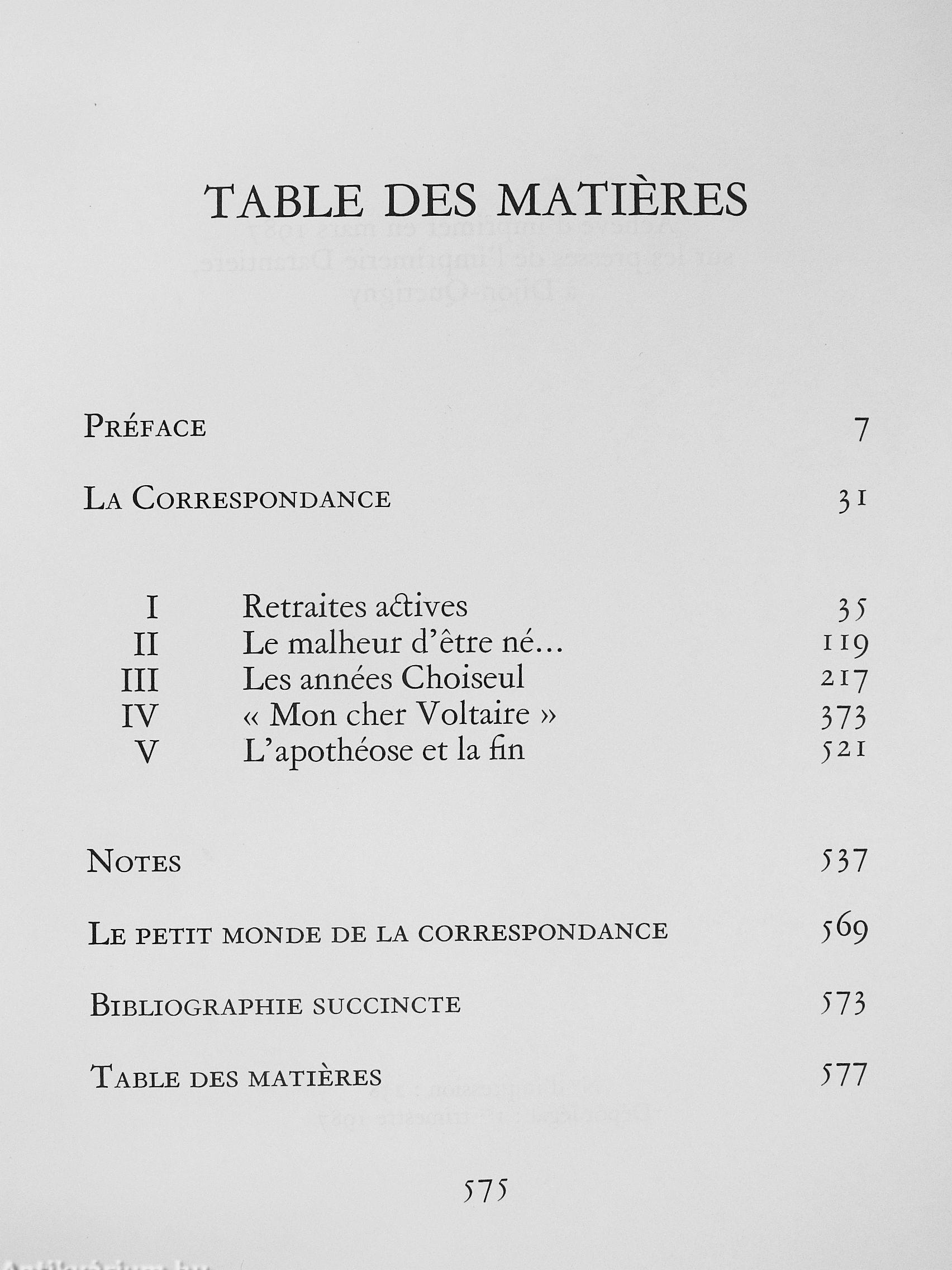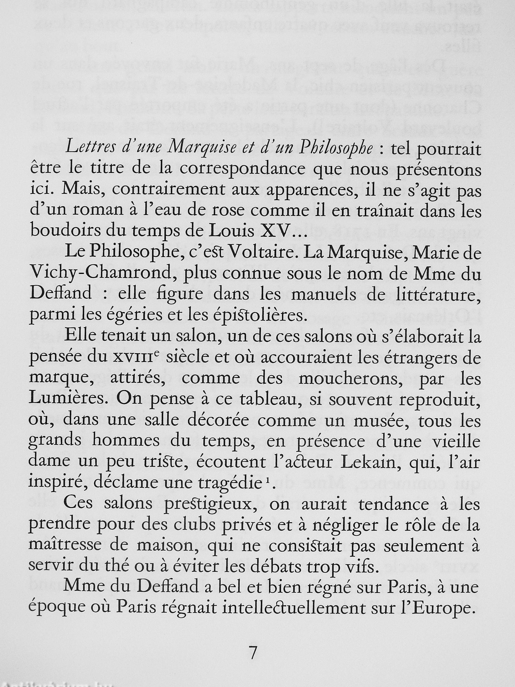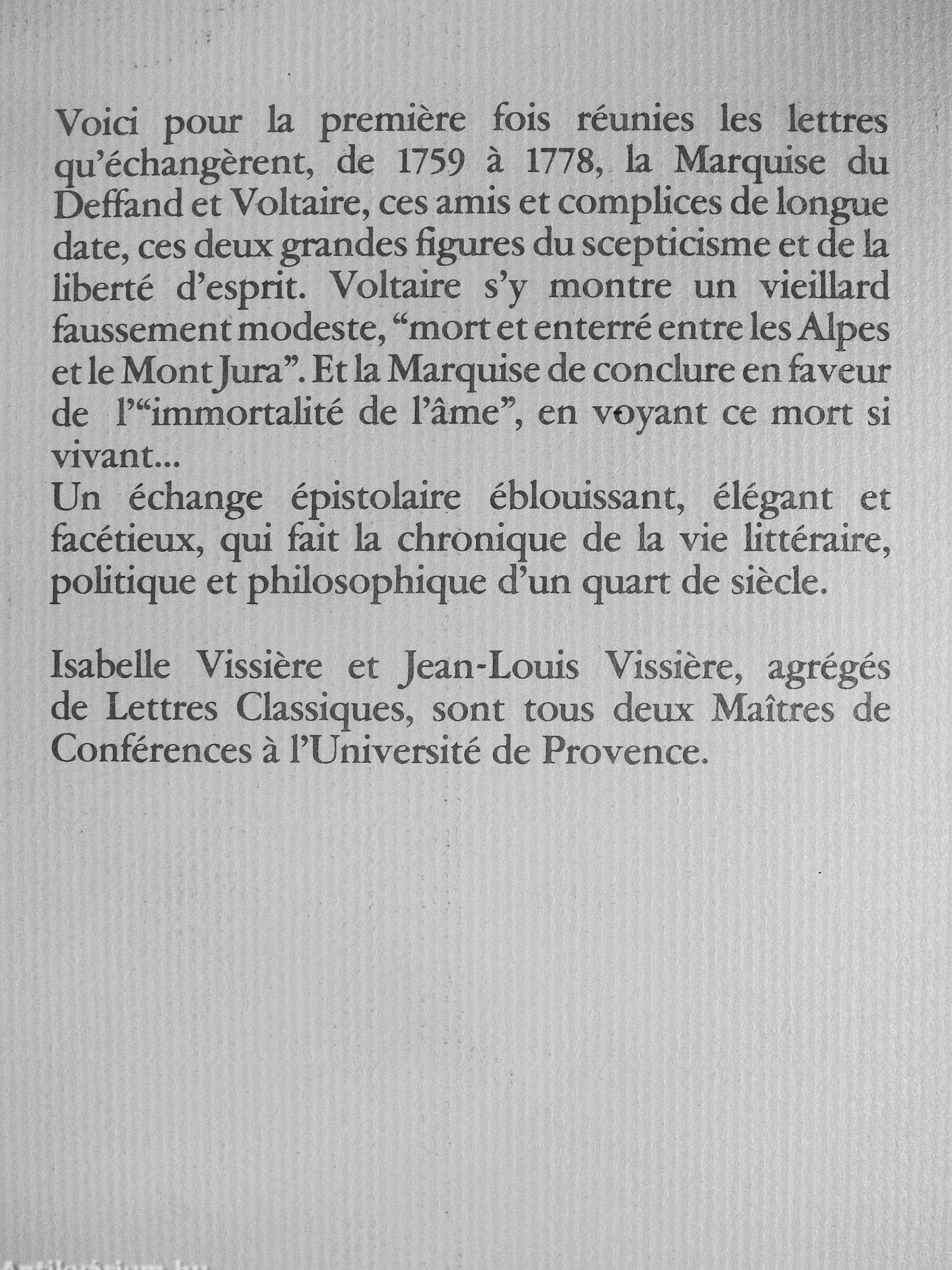 Voici pour la premiere fois réunies les lettres qu'échangerent, de 1759 a 1778, la Marquise du Deffand et Voltaire, ces amis et complices de longue date, ces deux grandes figures du scepticisme et de la liberté d'esprit. Voltaire s'y montre un vieillard faussement modeste, "mort et enterré entre les Alpes et le Montjura". Et la Marquise de conclure en faveur de r"immortalité de l'âme", en voyant ce mort si vivant-