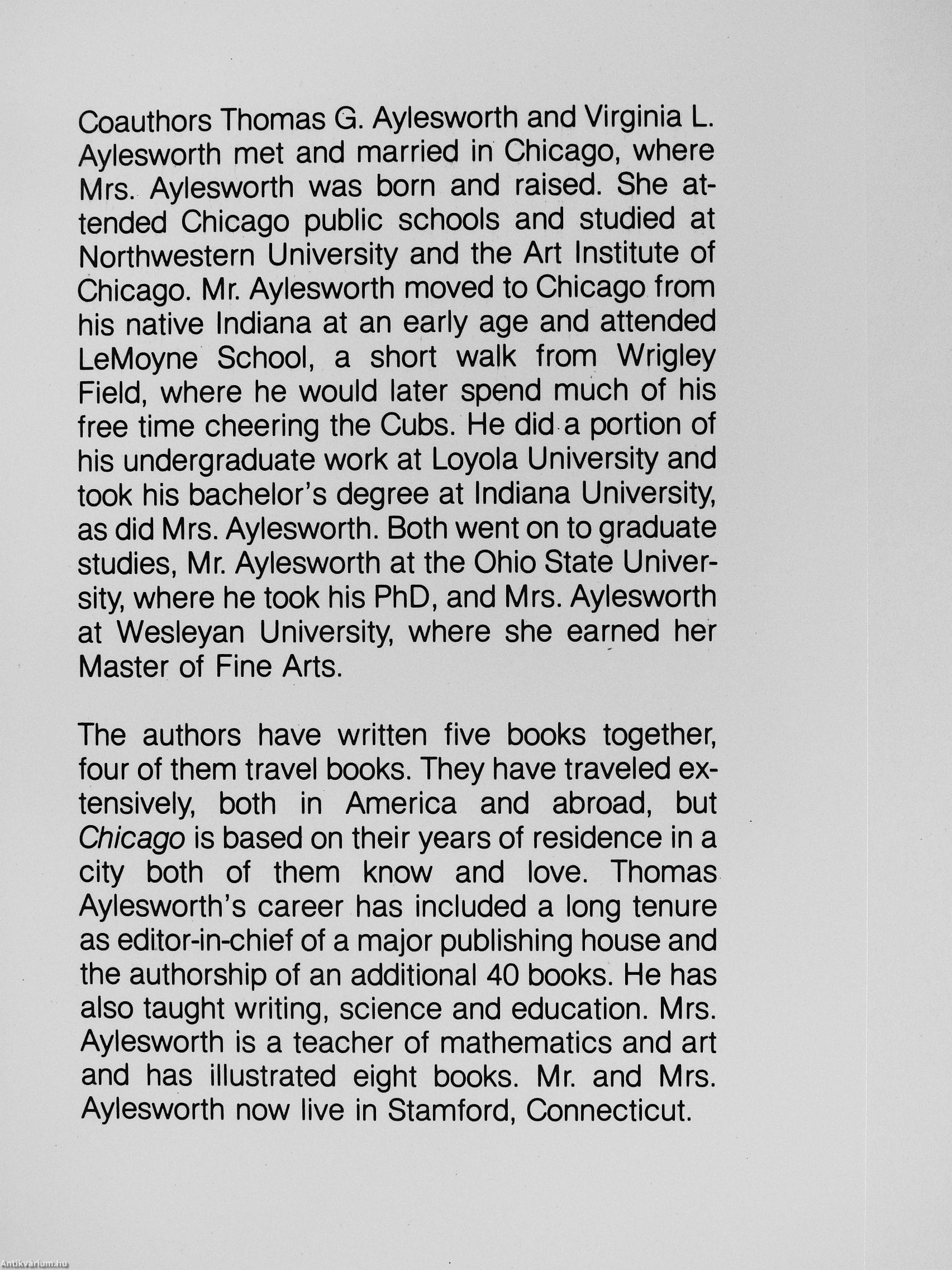 The authors have written five books together, four of them travel books. They have traveled extensively, both in America and abroad, but Chicago is based on their years of residence in a city both of them know and love. Thomas Aylesworth's career has included a long tenure as editor-in-chief of a major publishing house and the authorship of an additional 40 books. He has also taught writing, science and education. Mrs. Aylesworth is a teacher of mathematics and art and has illustrated eight books. Mr. and Mrs. Aylesworth now live in Stamford, Connecticut.