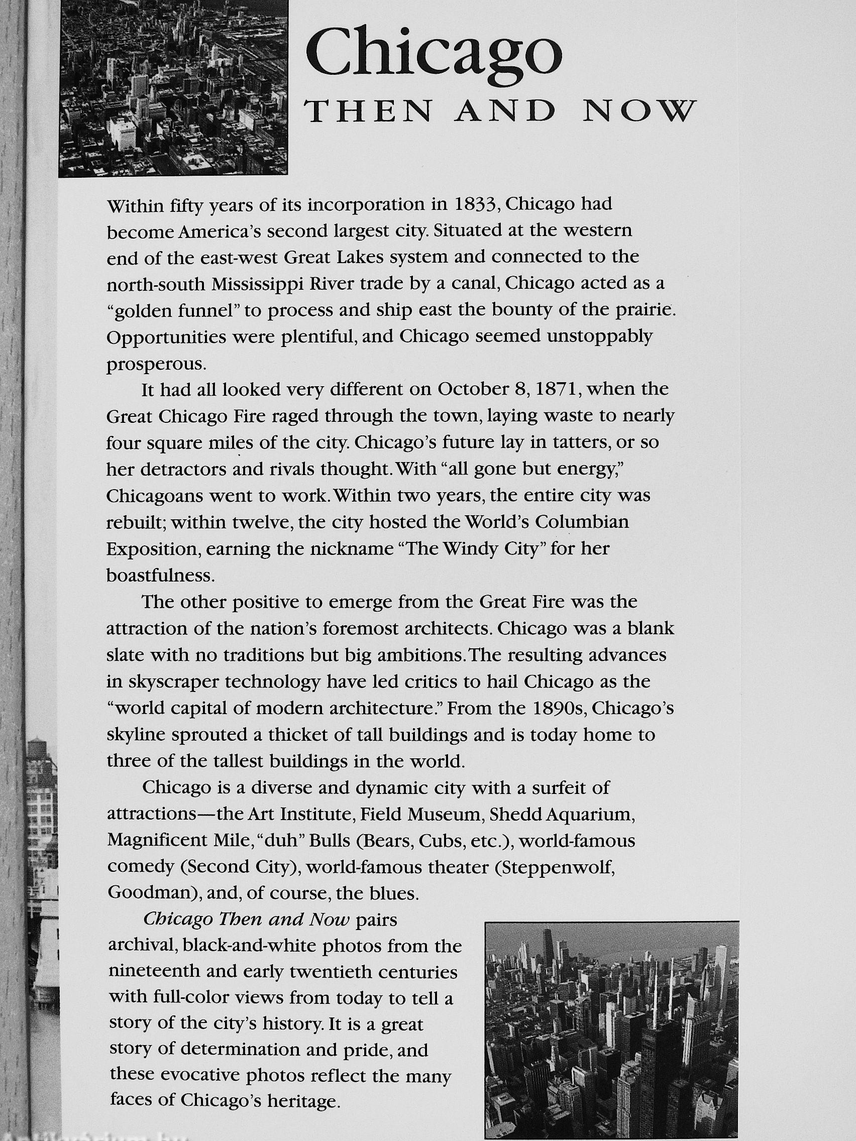 Chicago Then and Now pairs archival, black-and-white photos from the nineteenth and early twentieth centuries with full-color views from today to tell a story of the city's history. It is a great story of determination and pride, and these evocative photos reflect the many faces of Chicago's heritage.