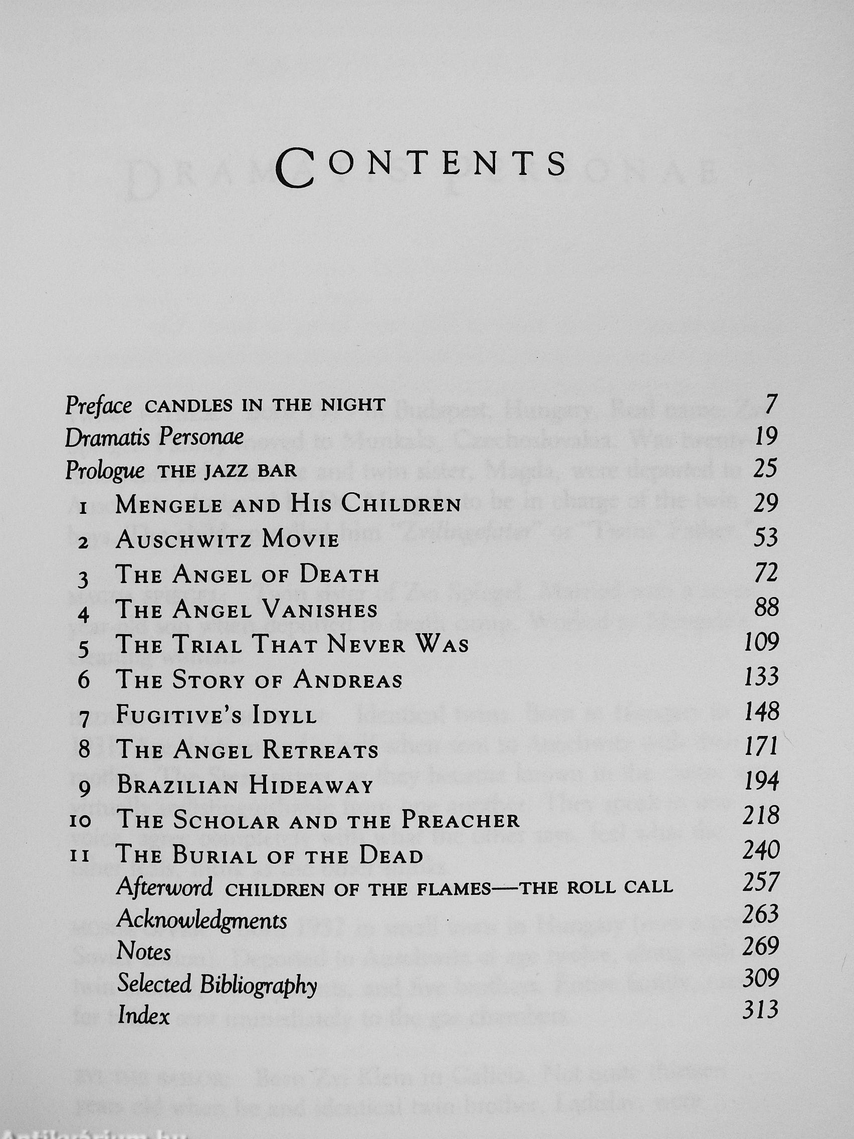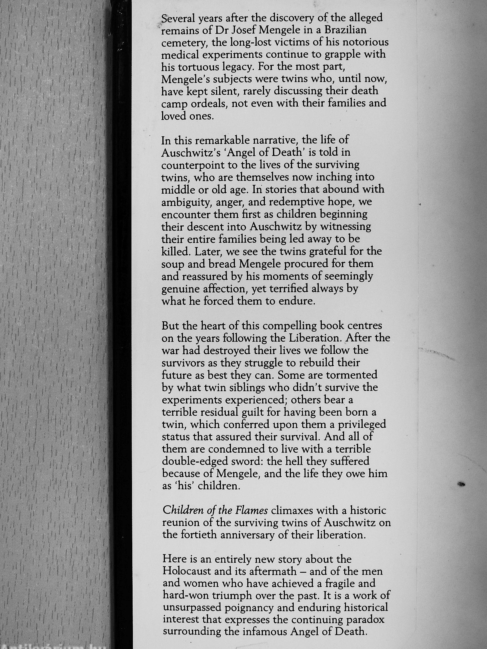 In this remarkable narrative, the life of Auschwitz's 'Angel of Death' is told in counterpoint to the lives of the surviving twins, who are themselves now inching into middle or old age. In stories that abound with ambiguity, anger, and redemptive hope, we encounter them first as children beginning their descent into Auschwitz by witnessing their entire families being led away to be killed. Later, we see the twins grateful for the soup and bread Mengele procured for them and reassured by his moments of seemingly genuine affection, yet terrified always by what he forced them to endure.