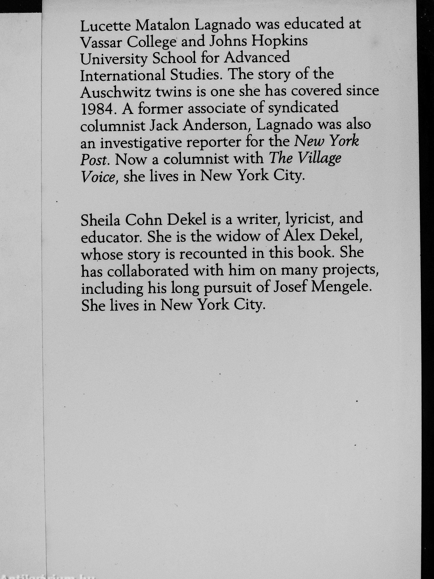 Lucette Matalon Lagnado was educated at Vassar College and Johns Hopkins University School for Advanced International Studies. The story of the Auschwitz twins is one she has covered since 1984. A former associate of syndicated columnist Jack Anderson, Lagnado was also an investigative reporter for the New York Post. Now a columnist with The Village Voice, she lives in New York City.