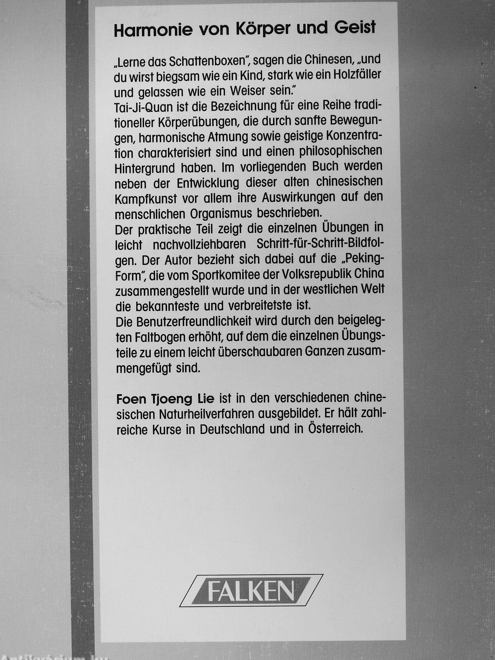 „Lerne das Schattenboxen", sagen die Chinesen, „und du wirst biegsam wie ein Kind, stark wie ein Holzfäller und gelassen wie ein Welser sein." Tai-Ji-Quan ist die Bezeichnung für eine Reihe traditioneller Körperübungen, die durch sanfte Bewegungen, harmonische Atmung sowie geistige Konzentration charakterisiert sind und einen philosophischen Hintergrund haben. Im vorliegenden Buch werden neben der Entwicklung dieser alten chinesischen Kampfkunst vor allem ihre Auswirkungen auf den menschlichen Organismus beschrieben. Der praktische Teil zeigt die einzelnen Übungen in leicht nachvollziehbaren Schritt-für-Schritt-Bildfol-gen. Der Autor bezieht sich dabei auf die „Peking-Form" die vom Sportkomitee der Volksrepublik China zusammengestellt wurde und in der westlichen Welt die bekannteste und verbreitetste ist Die Benutzerfreundlichkeit wird durch den beigelegten Faltbogen erhöht, auf dem die einzelnen Übungsteile zu einem leicht überschaubaren Ganzen... Tovább