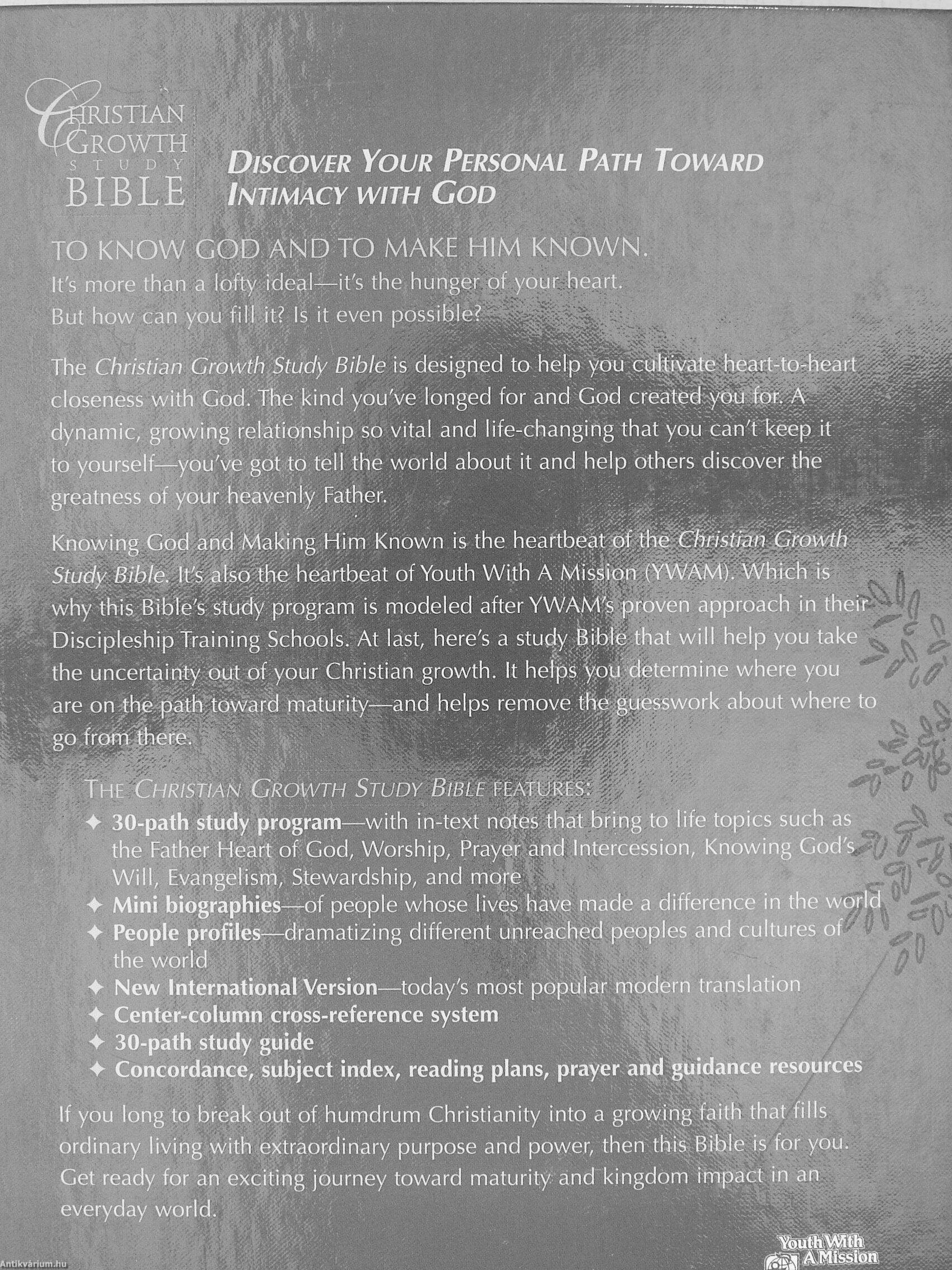 Study Bible. It's also the heartbeat of Youth With A Mission (YWAM) Which is why this Bible's study program is modeled after YWAM's proven approach in their Discipleship Training Schools. At last, here's a study Bible that will help you take the uncertainty out of your Christian growth. It helps you determine where you are onihe path toward maturity—and helps remove the^uesswork about where to go,from there. V ^ Ht
