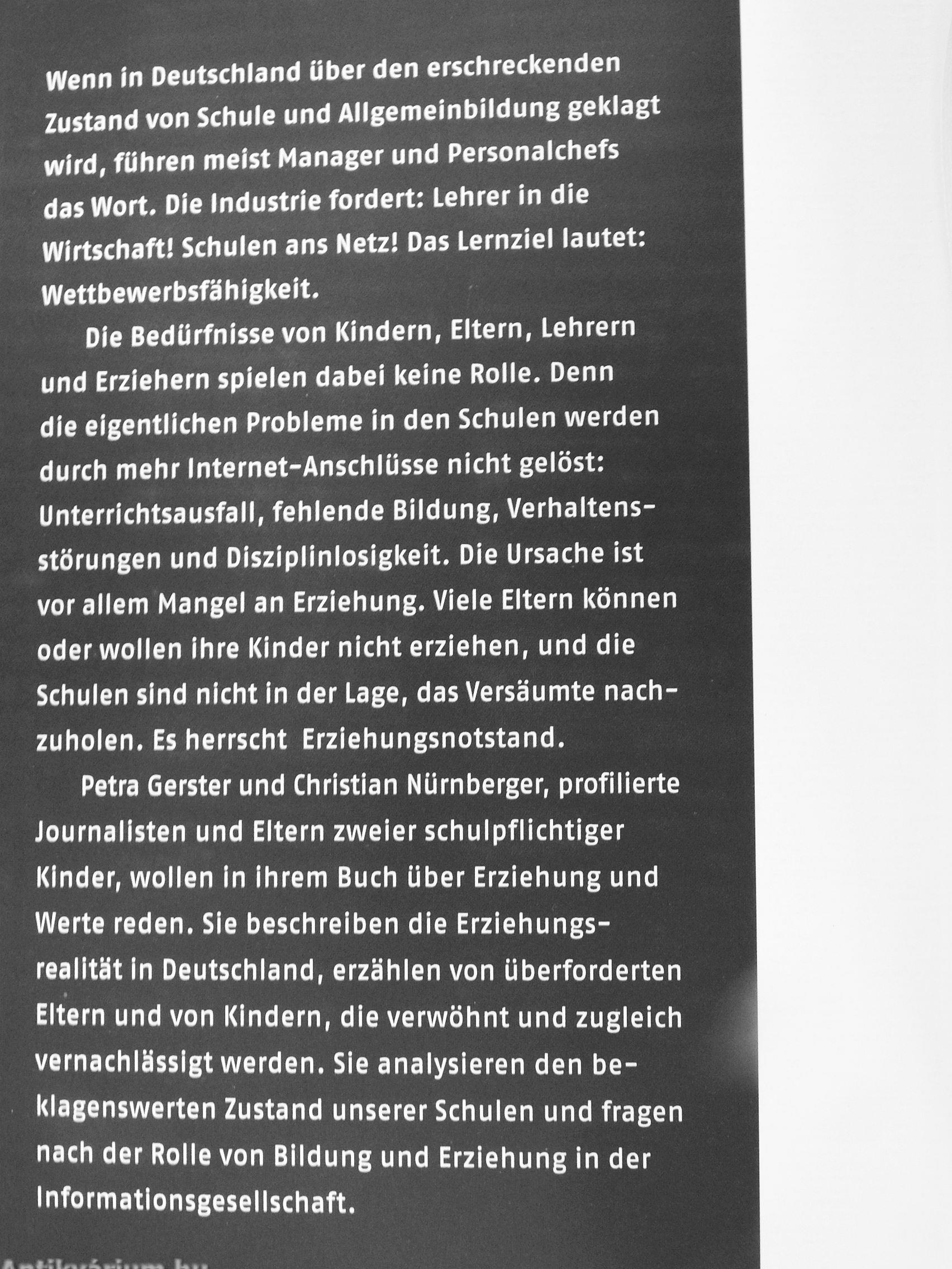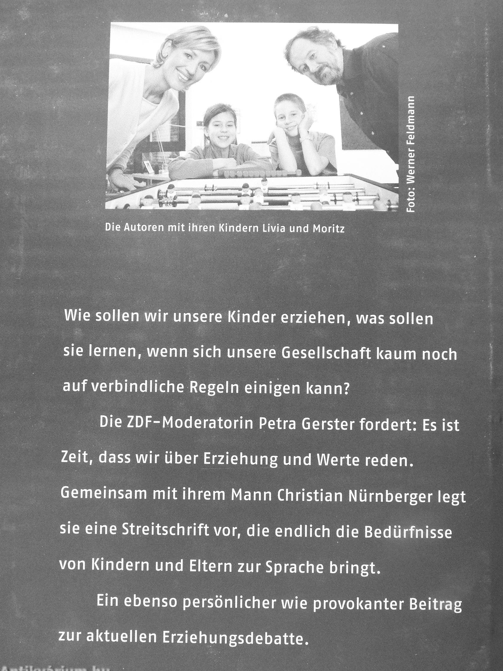 Petra Gerster und Christian Nürnberger, profilierte Journalisten und Eltern zweier schulpflichtiger Kinder, wollen in Ihrem Buch Uber Erziehung und Werte reden. Sie beschreiben die Erziehungs-realltat In Deutschland, erzählen von überforderten Eltern und von Kindern, die verwöhnt und zugleich vernachlässigt werden. Sie analysieren den beklagenswerten Zustand unserer Schulen und fragen nach der Rolle von Bildung und Erziehung in der