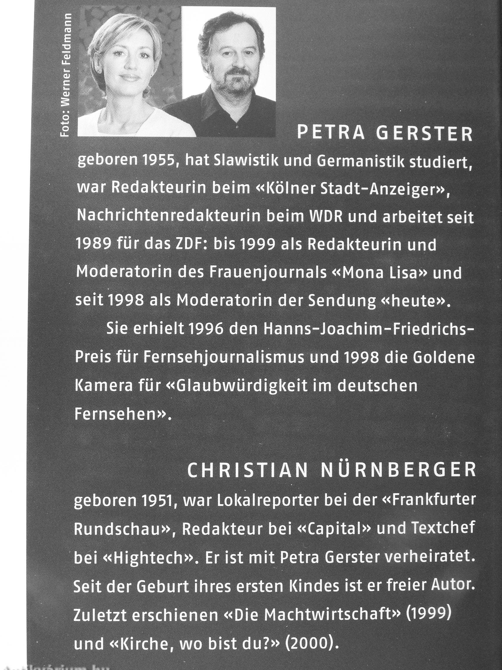 CHRISTIAN NÜRNBERGER geboren 1951, war Lokalreporter bei der «Frankfurter Rundschau», Redakteur bei «Capital» und Textchef bei «Hightech». Er ist mit Petra Gerster verheiratet. Seit der Geburt ihres ersten Kindes ist er freier Autor. Zuletzt erschienen «Die Machtwirtschaft» (1999) und «Kirche, wo bist du?» (2000).