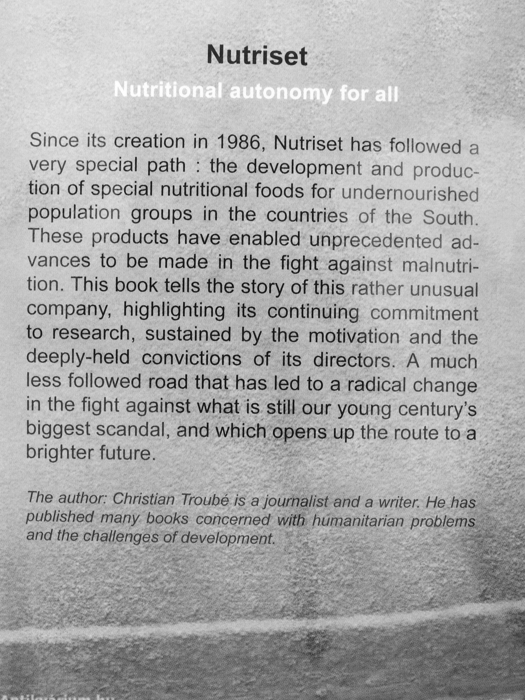 Since its creation in 1986, Nutriset has followed a very special path : the development and production of special nutritional foods for undernourished population groups in the countries of the South. These products have enabled unprecedented advances to be made in the fight against malnutrition. This book tells the story of this rather unusual company, highlighting its continuing commitment to research, sustained by the motivation and the deeply-held convictions of its directors. A much less followed road that has led to a radical change in the fight against what is still our young century's biggest scandal, and which opens up the route to a brighter future.