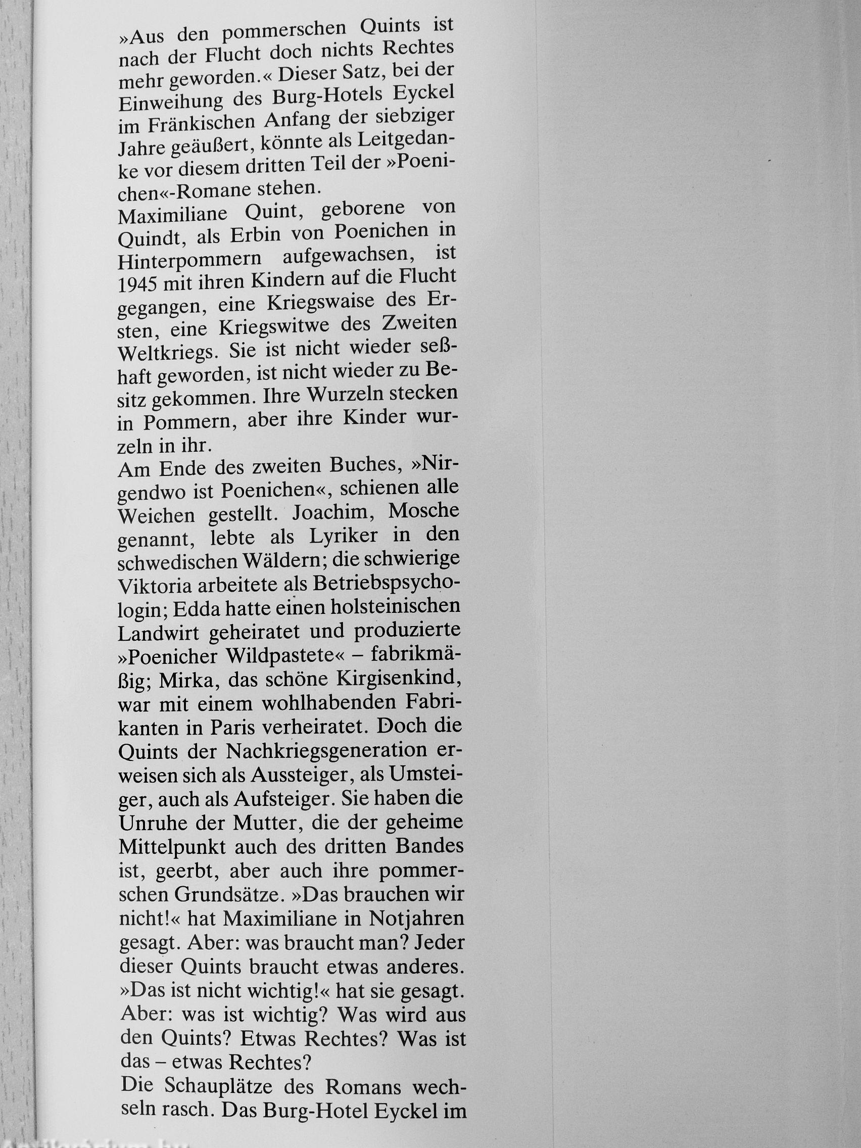 »Aus den pommerschen Quints ist nacli der Flucht doch nichts Rechtes mehr geworden.« Dieser Satz, bei der Einweihung des Burg-Hotels Eyckel im Fränkischen Anfang der siebziger Jahre geäußert, könnte als Leitgedanke vor diesem dritten Teil der »Poeni-chen«-Romane stehen. Maximiliane Quint, geborene von Quindt, als Erbin von Poenichen in Hinterpommern aufgewachsen, ist 1945 mit ihren Kindern auf die Flucht gegangen, eine Kriegswaise des Ersten, eine Kriegswitwe des Zweiten Weltkriegs. Sie ist nicht wieder seßhaft geworden, ist nicht wieder zu Besitz gekommen. Ihre Wurzeln stecken in Pommern, aber ihre Kinder wurzeln in ihr.