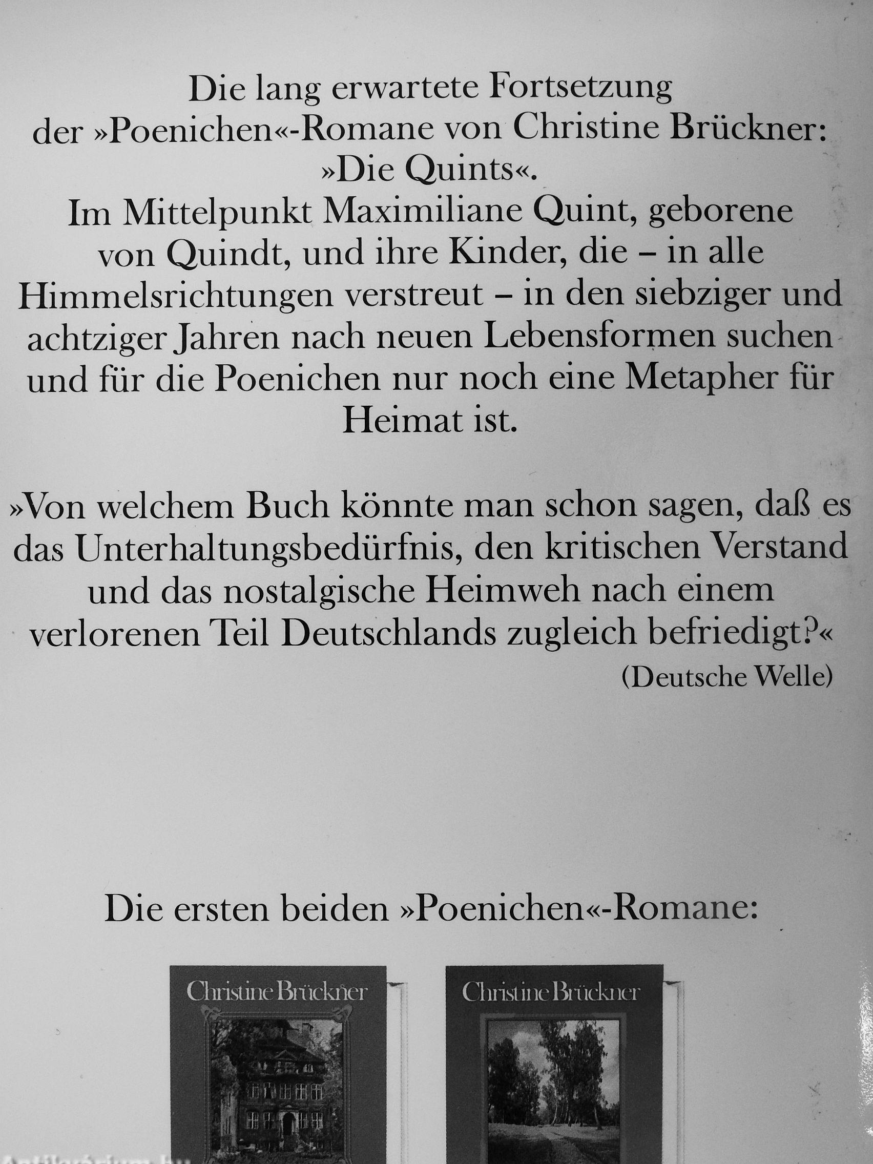Fränkischen; ein verlassenes Dorf in der Provence; das Heidekloster Plummbüttel bei Lüneburg; ein Rüstungsbetrieb in der Nähe von Paris; das Atelier eines Couturiers, aber auch Bonn. Wieder geht ein Quint in die Politik wie jener legendäre »alte Quindt« aus Poenichen, dessen Quindt-Essenzen noch immer gegenwärtig sind; neue Quint-Essenzen kommen hinzu, neue Maximen. So unterschiedlich diese Quints sind, eines haben sie gemeinsam: sie suchen nach neuen Lebensformen. Poenichen ist nur noch eine Metapher für Heimat. Jenes Land jenseits von Oder und Neiße.