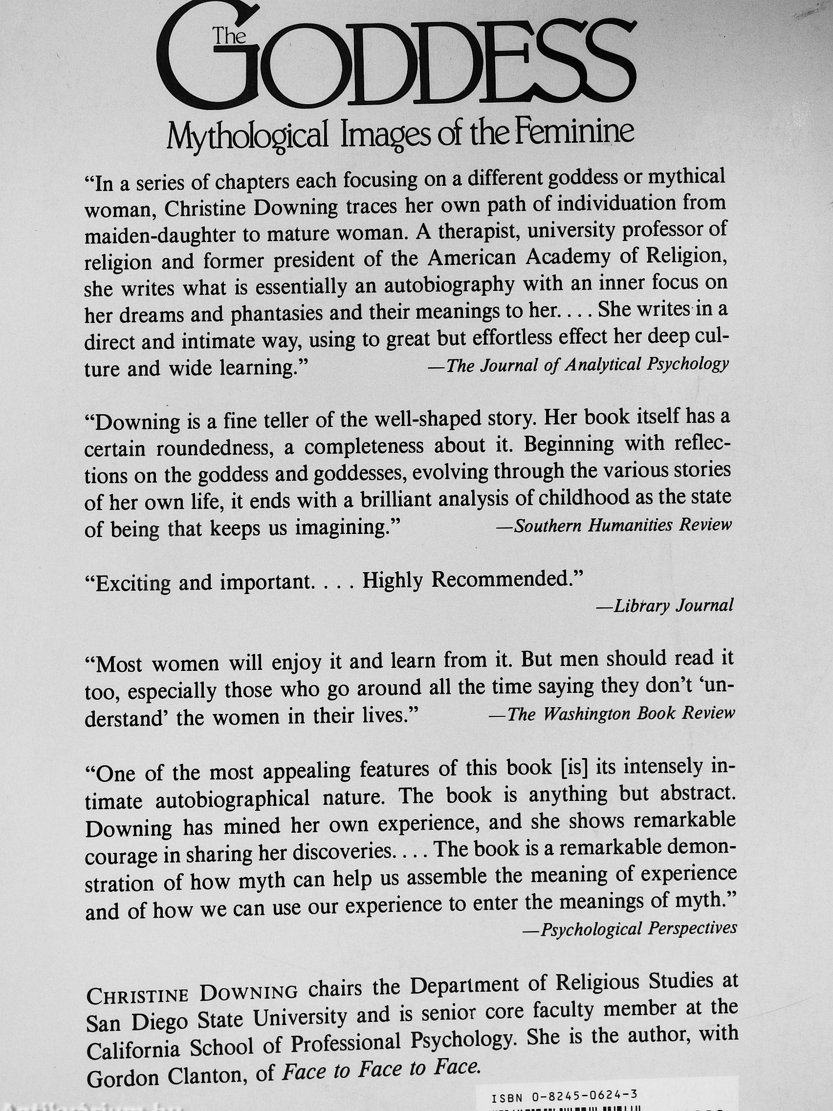 "In a series of chapters each focusing on a different goddess or mythical woman, Christine Downing traces her own path of individuation from maiden-daughter to mature woman. A therapist, university professor of religion and former president of the American Academy of Religion, she writes what is essentially an autobiography with an inner focus on