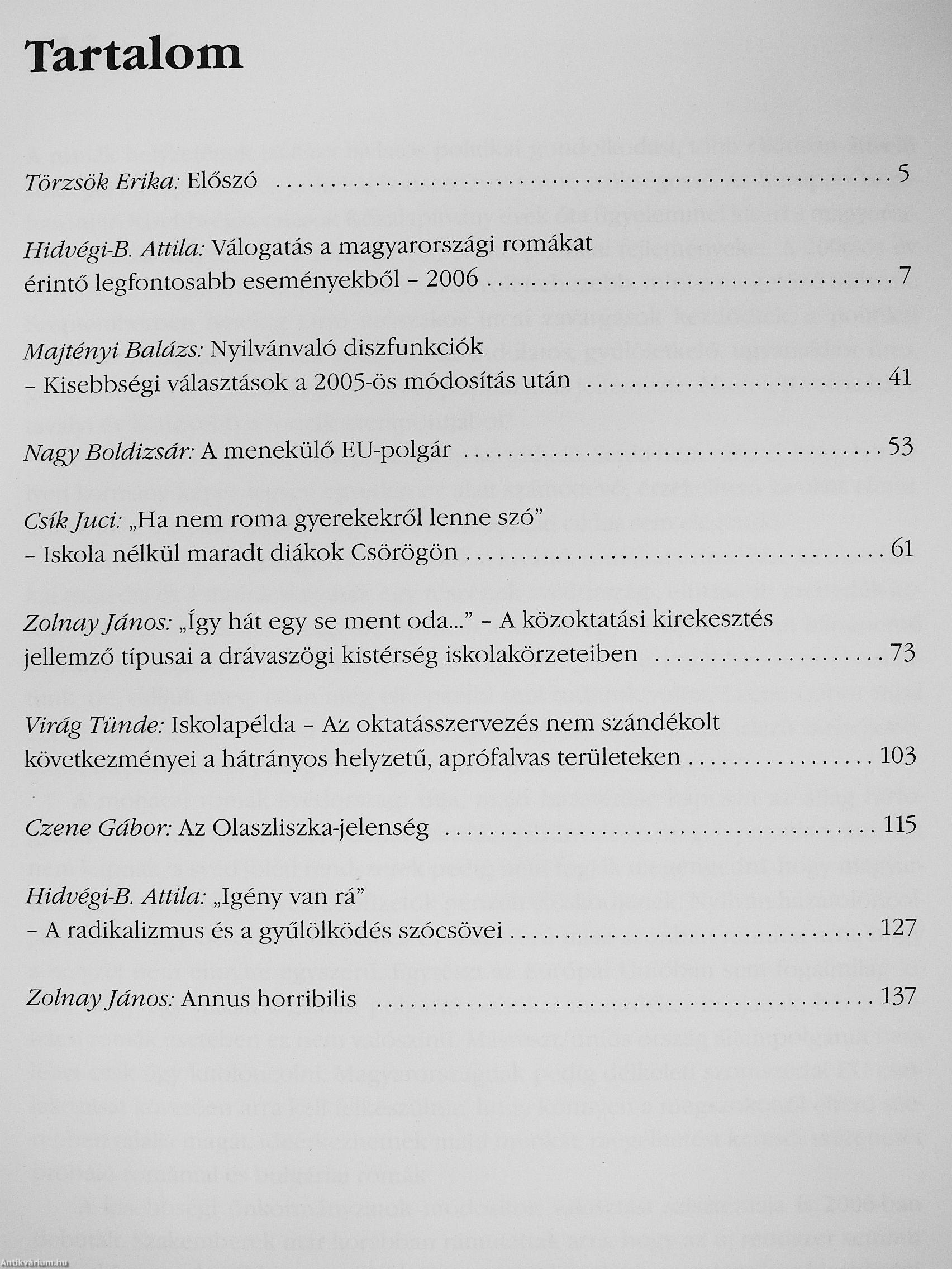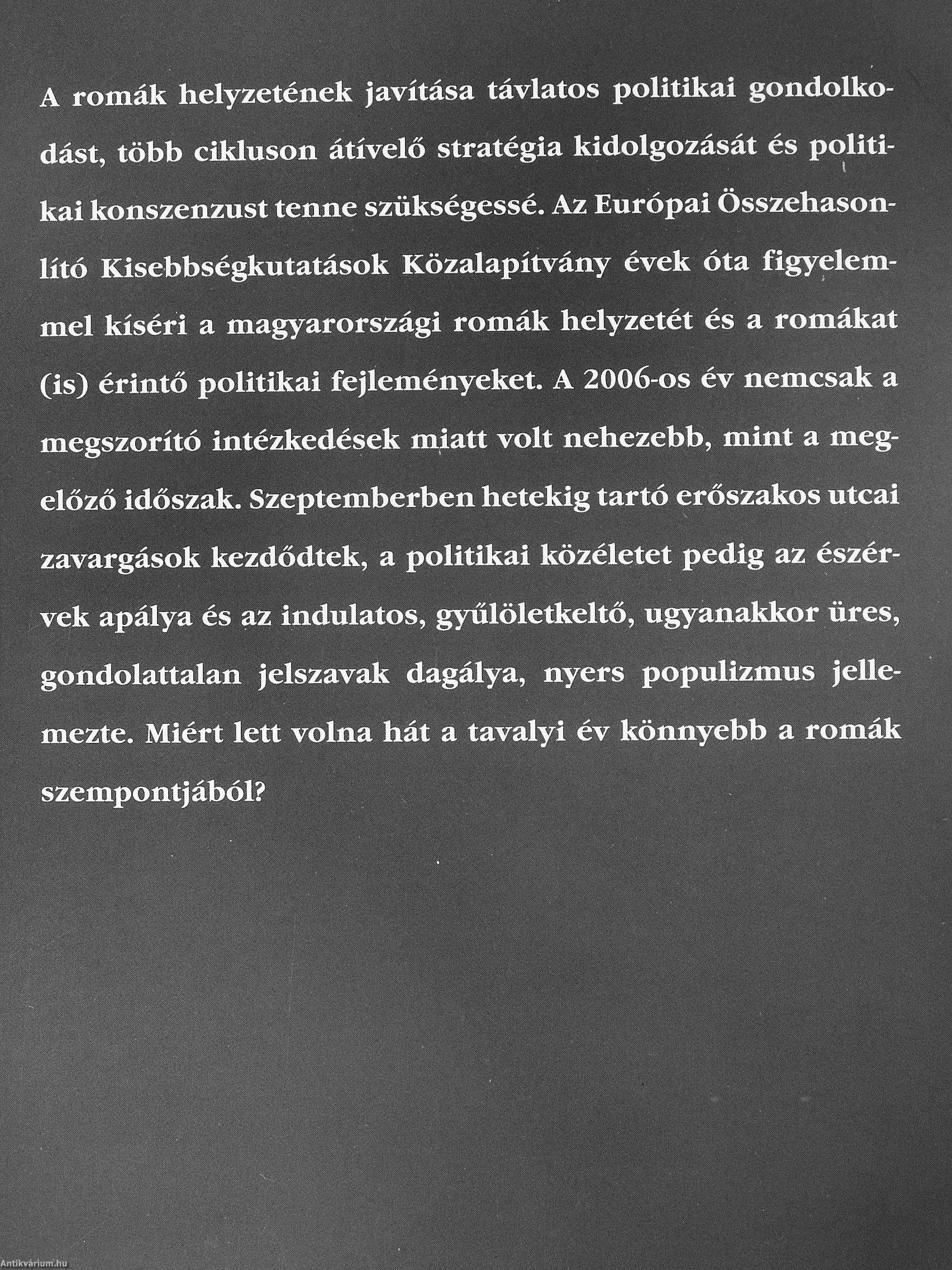 kai konszenzust tenne szükségessé. Az Európai Összehasonlító Kisebbségkutatások Közalapítvány évek óta figyelemmel kíséri a magyarországi romák helyzetét és a romákat (is) érintő politikai fejleményeket. A 2006-os év nemcsak a megszorító intézkedések miatt volt nehezebb, mint a megelőző időszak. Szeptemberben hetekig tartó erőszakos utcai zavargások kezdődtek, a politikai közéletet pedig az észérvek apálya és az indulatos, gyűlöletkeltő, ugyanakkor üres, gondolattalan jelszavak dagálya, nyers populizmus jellemezte. Miért lett volna hát a tavalyi év könnyebb a romák szempontjából?