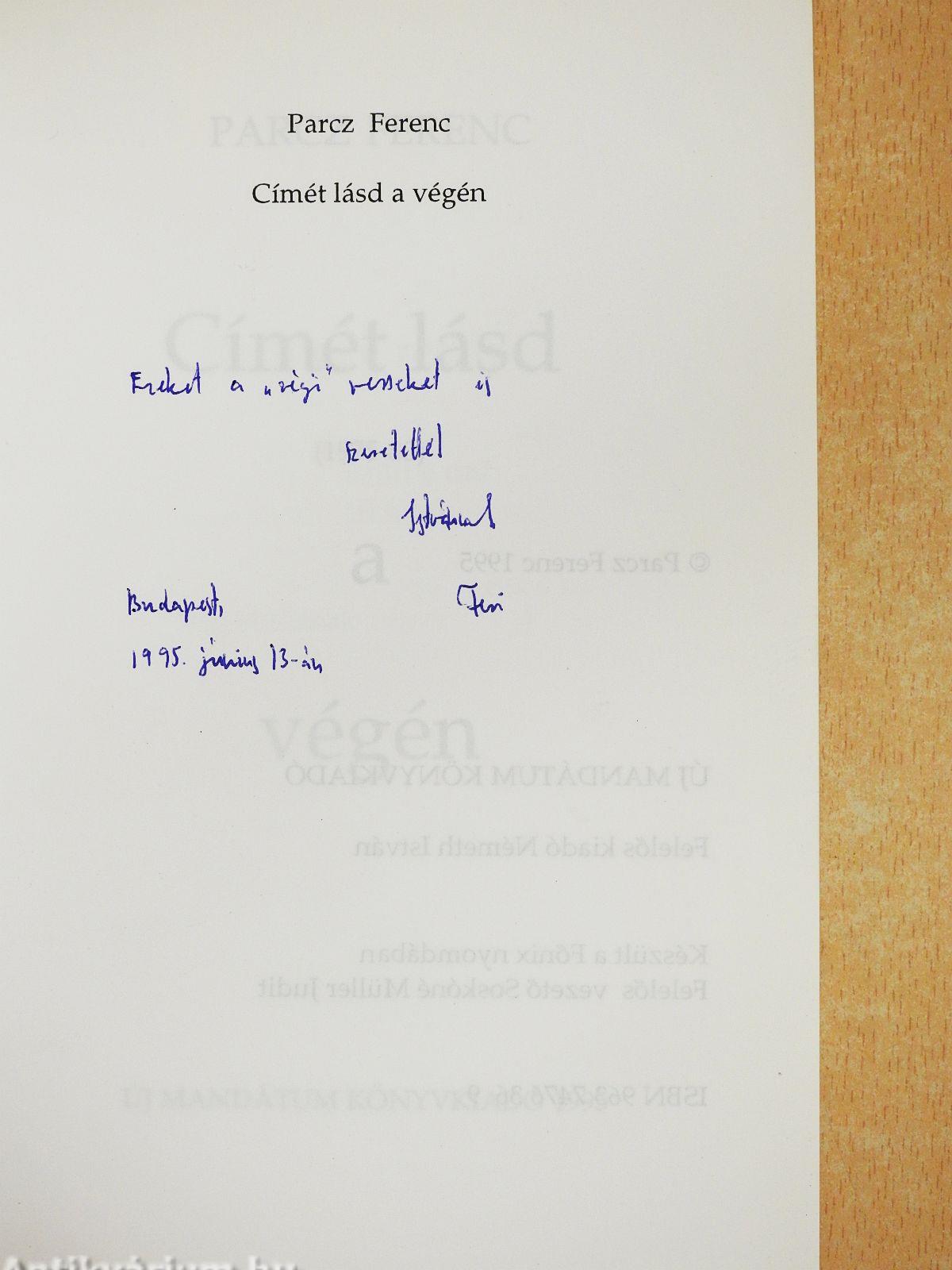 | Megjegyzés: | Parcz Ferenc szerző által dedikált példány. |