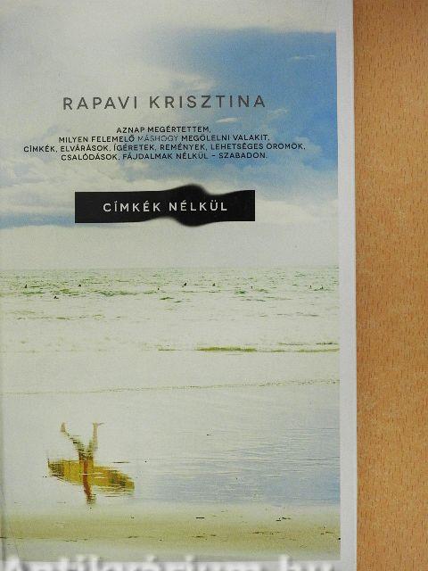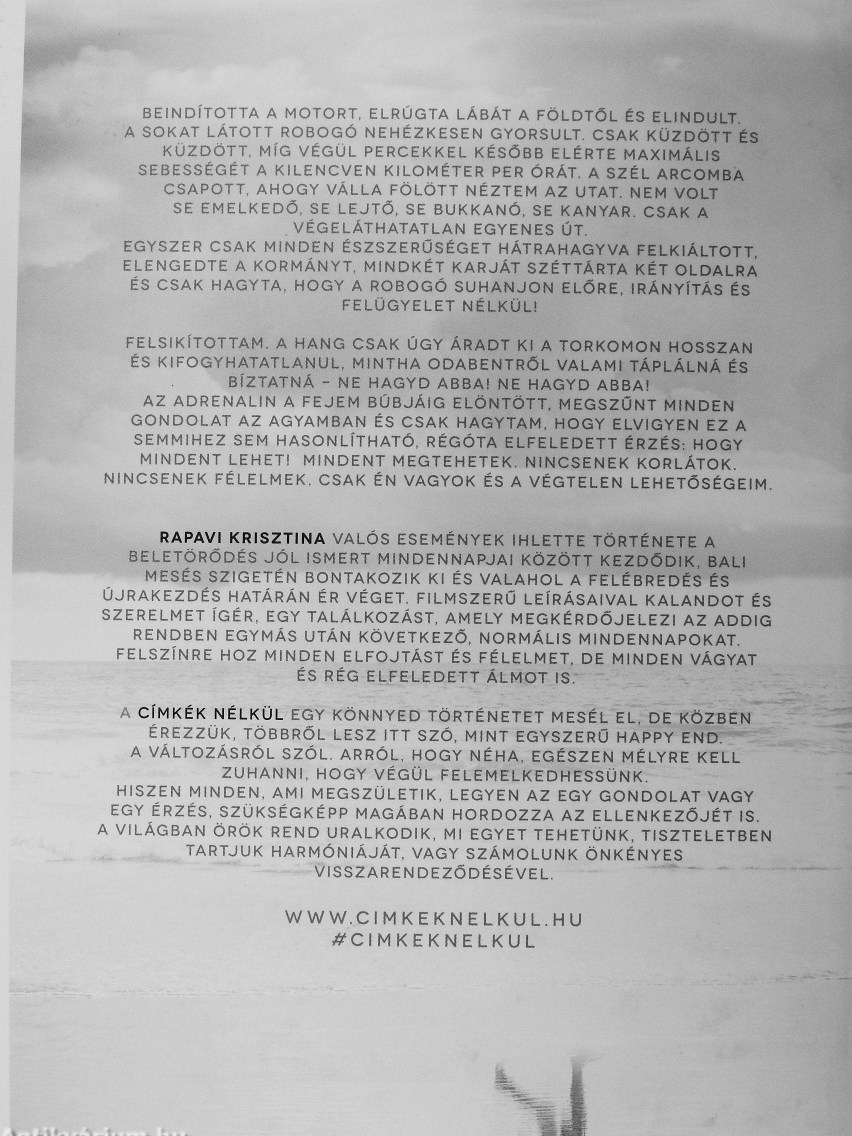 RAPAVI KRISZTINA VALÓS ESEMÉNYEK IHLETTE TÖRTÉNETE A BELETÖRŐDÉS JÓL ISMERT MINDENNAPJAI KÖZÖTT KEZDŐDIK, BAL! MESÉS SZIGETÉN BONTAKOZIK Kl ÉS VALAHOL A FELÉBREDÉS ÉS ÚJRAKEZDÉS HATÁRÁN ÉR VÉGET. FILMSZERŰ LEÍRÁSAIVAL KALANDOT ÉS SZERELMET ÍGÉR. EGY TALÁLKOZÁST, AMELY MEGKÉRDŐJELEZ! AZ ADDIG RENDBEN EGYMÁS UTÁN KÖVETKEZŐ. NORMÁLIS MINDENNAPOKAT. FELSZÍNRE HOZ MINDEN ELFOJTÁST ÉS FÉLELMET, DE MINDEN VÁGYAT ÉS RÉG ELFELEDETT ÁLMOT IS.