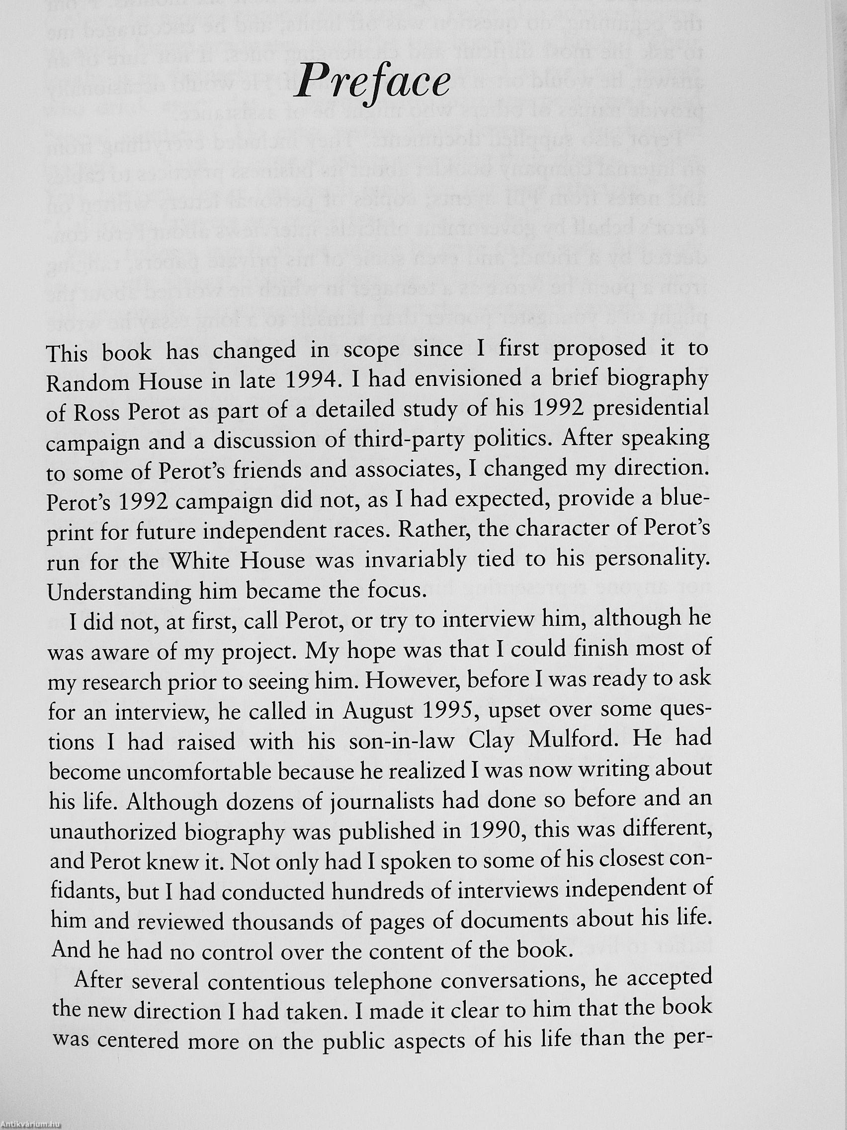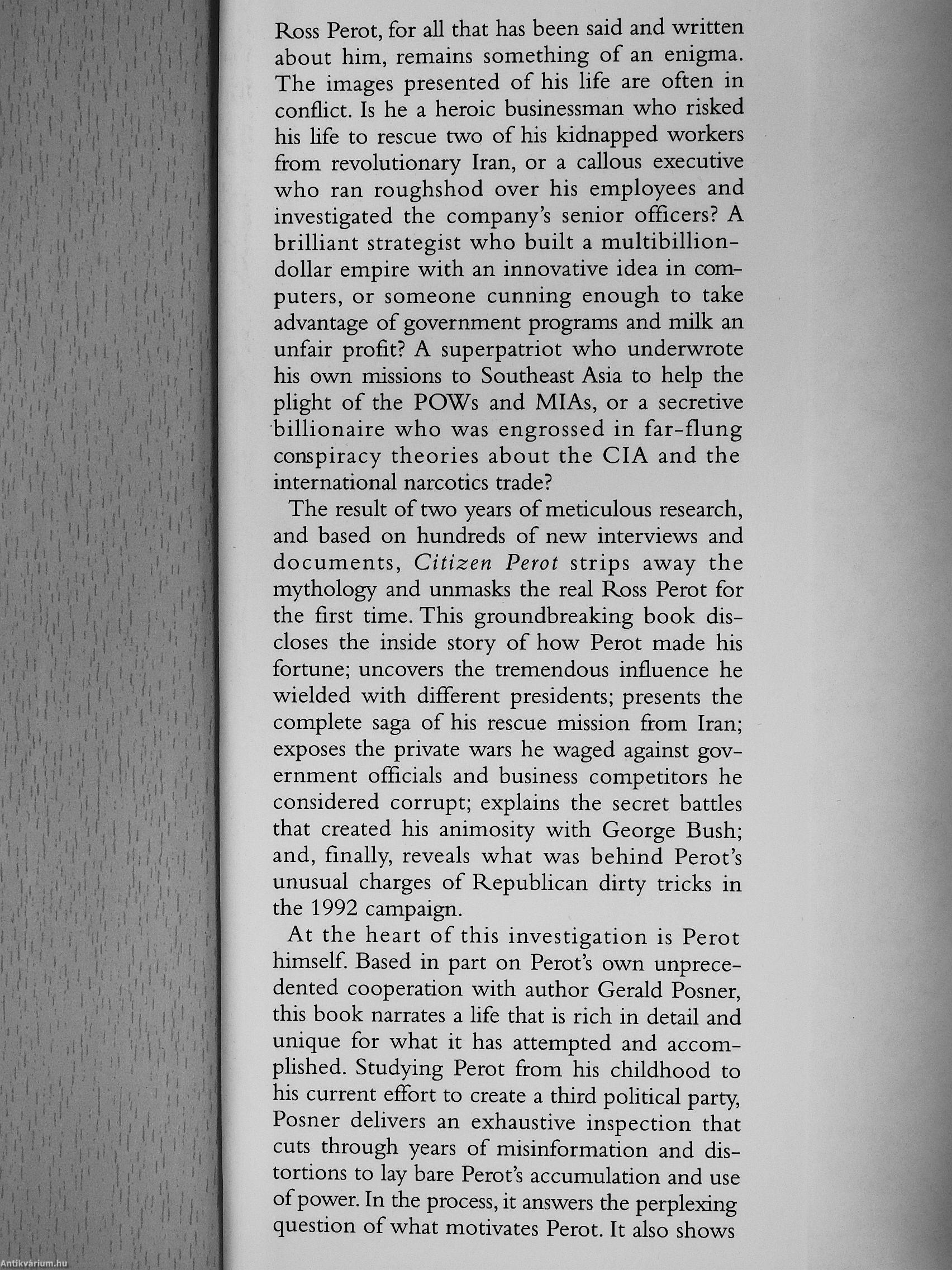 Ross Perot, for all that has been said and written about him, remains something of an enigma. The images presented of his life are often in conflict. Is he a heroic businessman who risked his life to rescue two of his kidnapped workers from revolutionary Iran, or a callous executive who ran roughshod over his employees and investigated the company's senior officers? A brilliant strategist who built a multibillion-dollar empire with an innovative idea in computers, or someone cunning enough to take advantage of government programs and milk an unfair profit? A superpatriot who underwrote his own missions to... Tovább