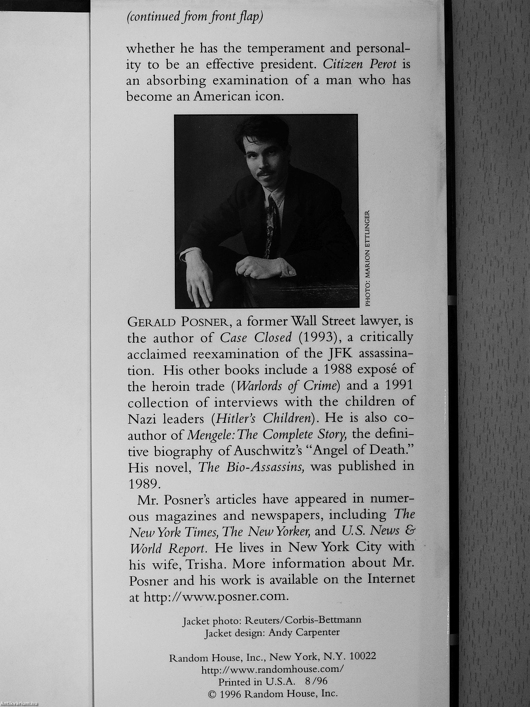 At the heart ofthis investigation is Perot himself Based in part on Perot's own unprecedented cooperation with author Gerald Posner, this book narrates a life that is rich in detail and unique for what it has attempted and accomplished. Studying Perot from his childhood to his current effort to create a third political party, Posner delivers an exhaustive inspection that cuts through years of misinformation and distortions to lay bare Perot's accumulation and use of power. In the process, it answers the perplexing question of what motivates Perot. It also shows