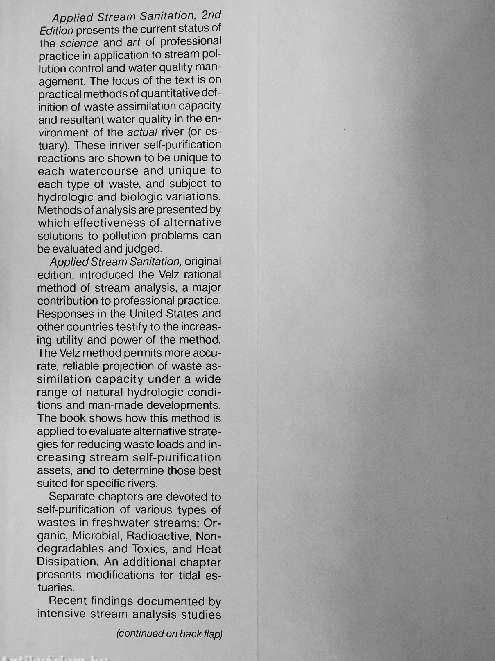 Applied Streanri Sanitation, original edition, introduced the Velz rational method of stream analysis, a major contribution to professional practice. Responses in the United States and other countries testify to the increasing utility and power of the method. The Velz method permits more accurate, reliable projection...