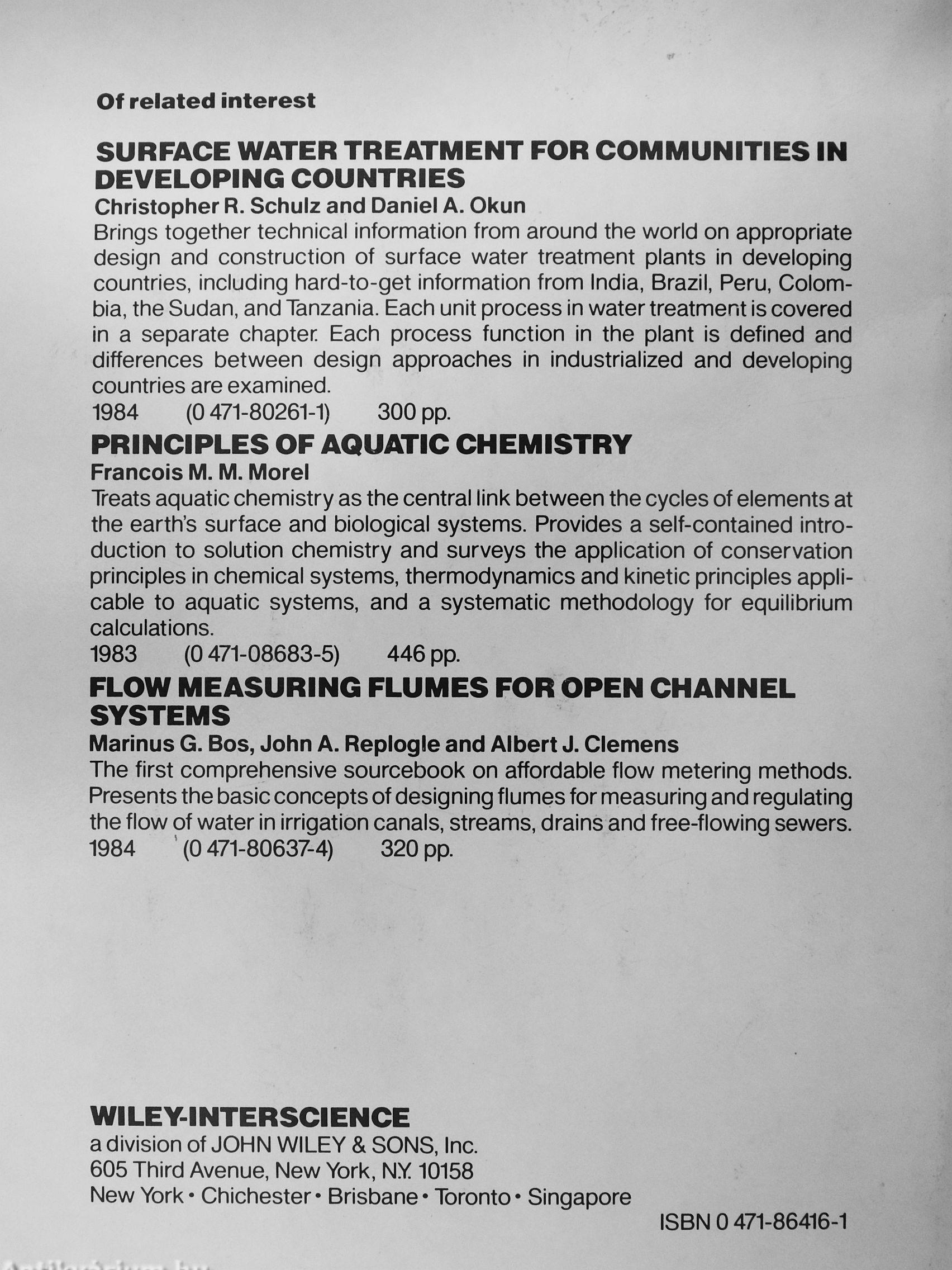Brings together technical information from around the world on appropriate design and construction of surface water treatment plants in developing countries, including hard-to-get information from India, Brazil, Peru, Colombia, the Sudan, and Tanzania. Each unit process in w/ater treatment is covered in a separate chapter Each process function in the plant is defined and differences between design approaches in industrialized and developing countries are examined. 1984 (0471-80261-1) 300 pp.