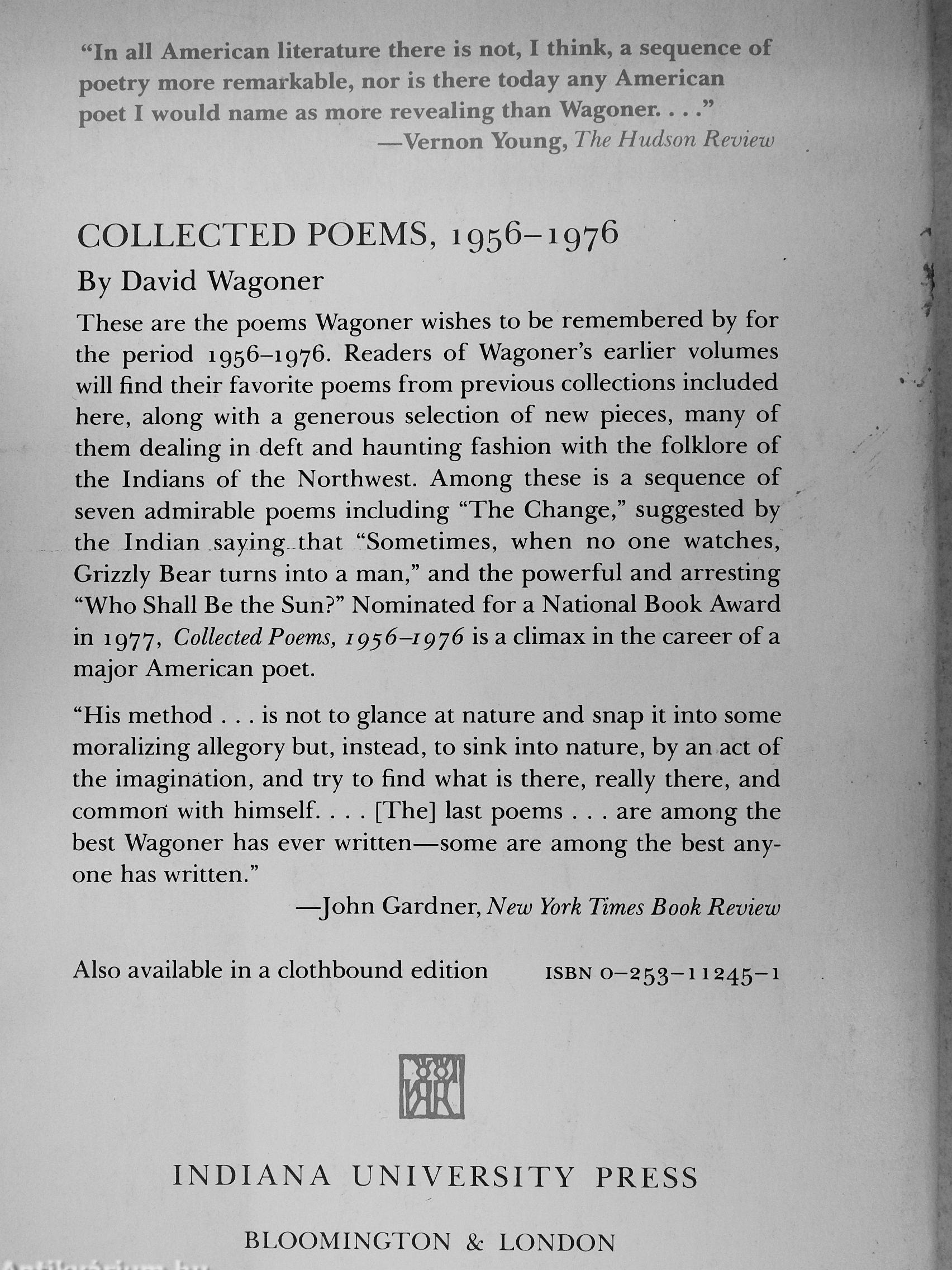 "In all American literature there is not, I think, a sequence of poetry more remarkable, nor is there today any American poet I would name as more revealing than Wagoner. . "