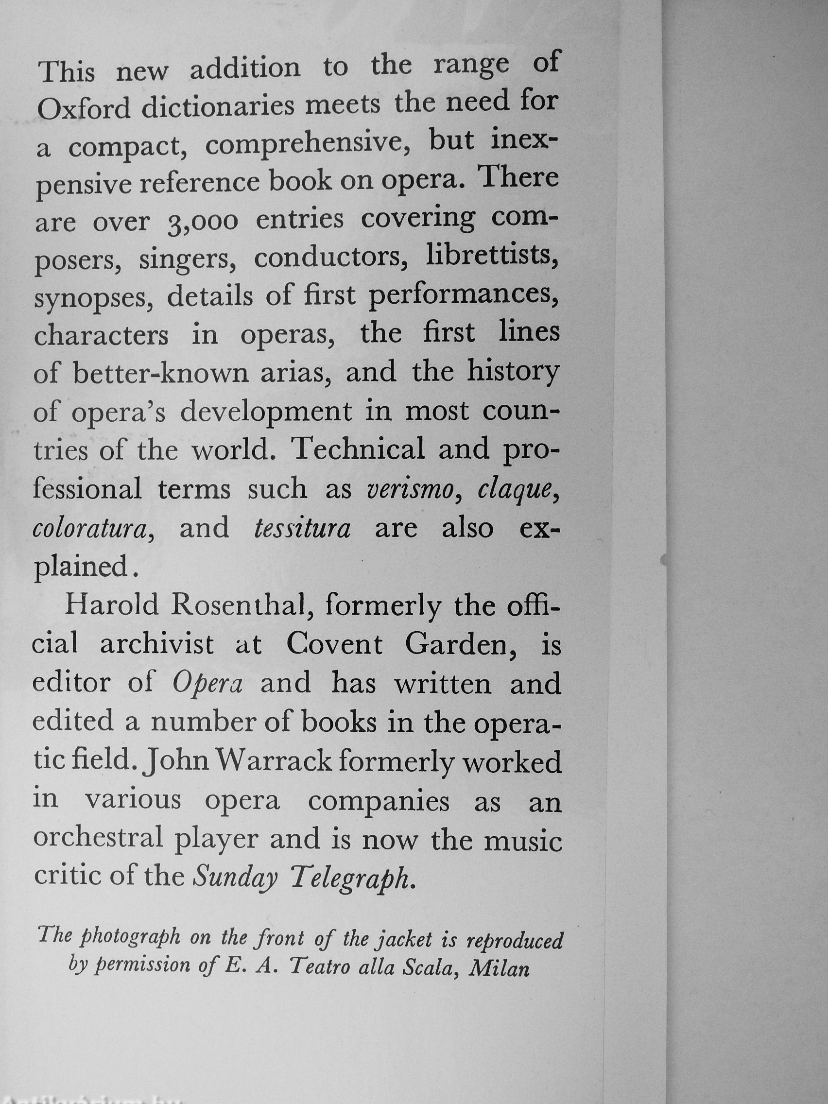 Harold Rosenthal, formerly the official archivist at Covent Garden, is editor of Opera and has written and edited a number of books in the operatic field. John Warrack formerly worked in various opera companies as an orchestral player and is now the music critic of the Sunday Telegraph.