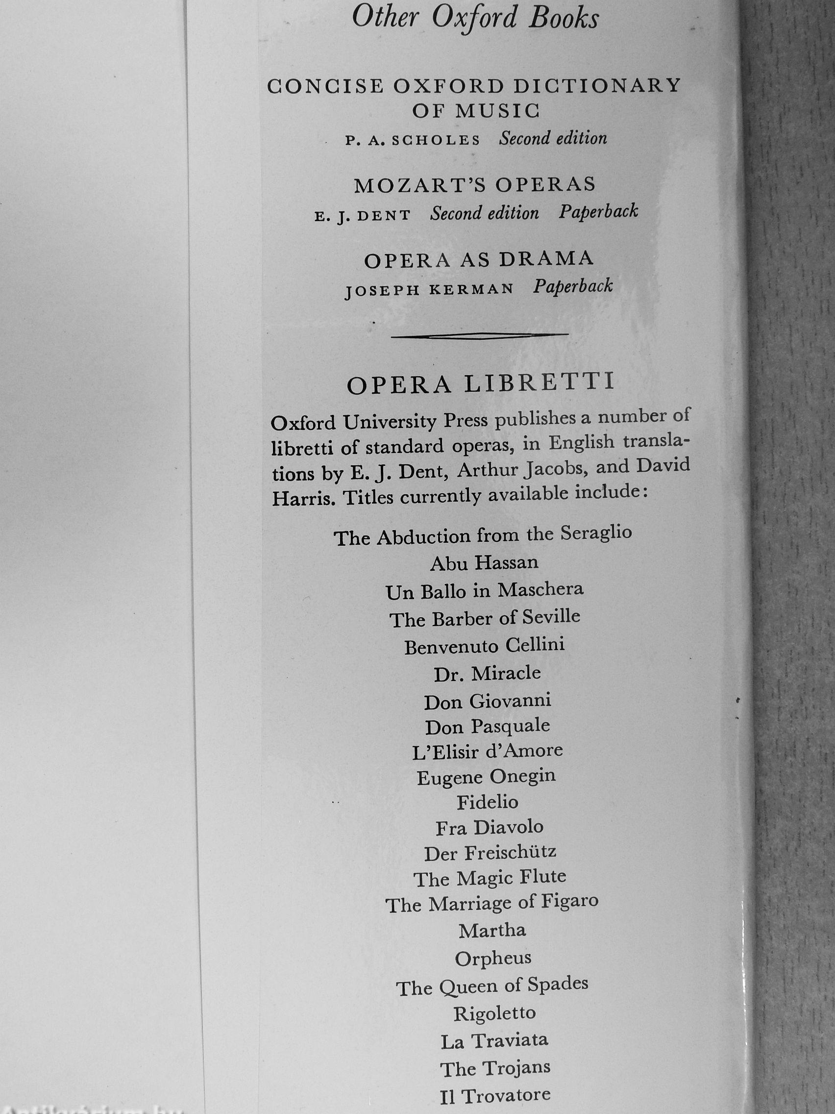 Oxford University Press publishes a number of libretti of standard operas, in English translations by E. J. Dent, Arthur Jacobs, and David Harris. Titles currently available include: