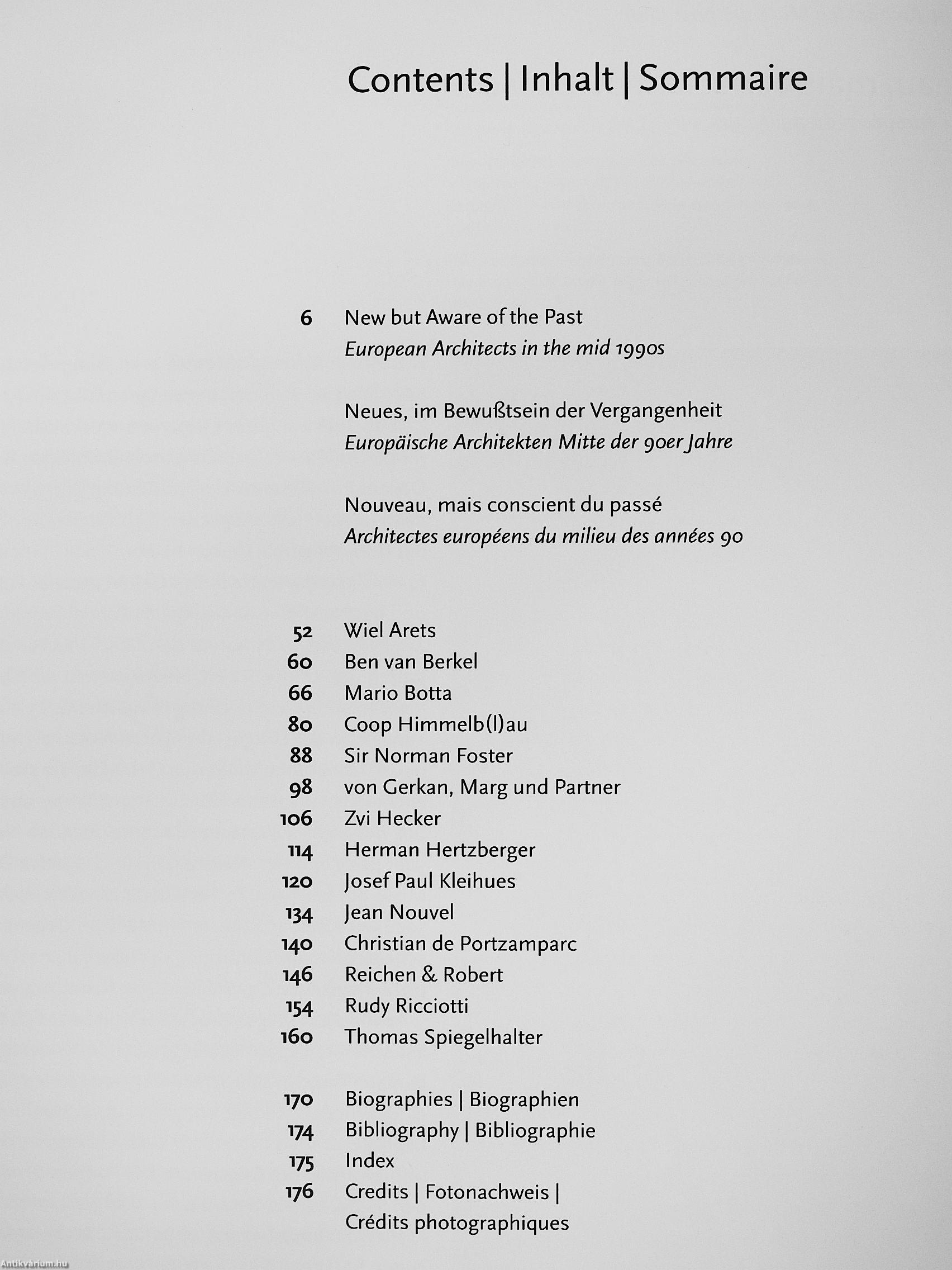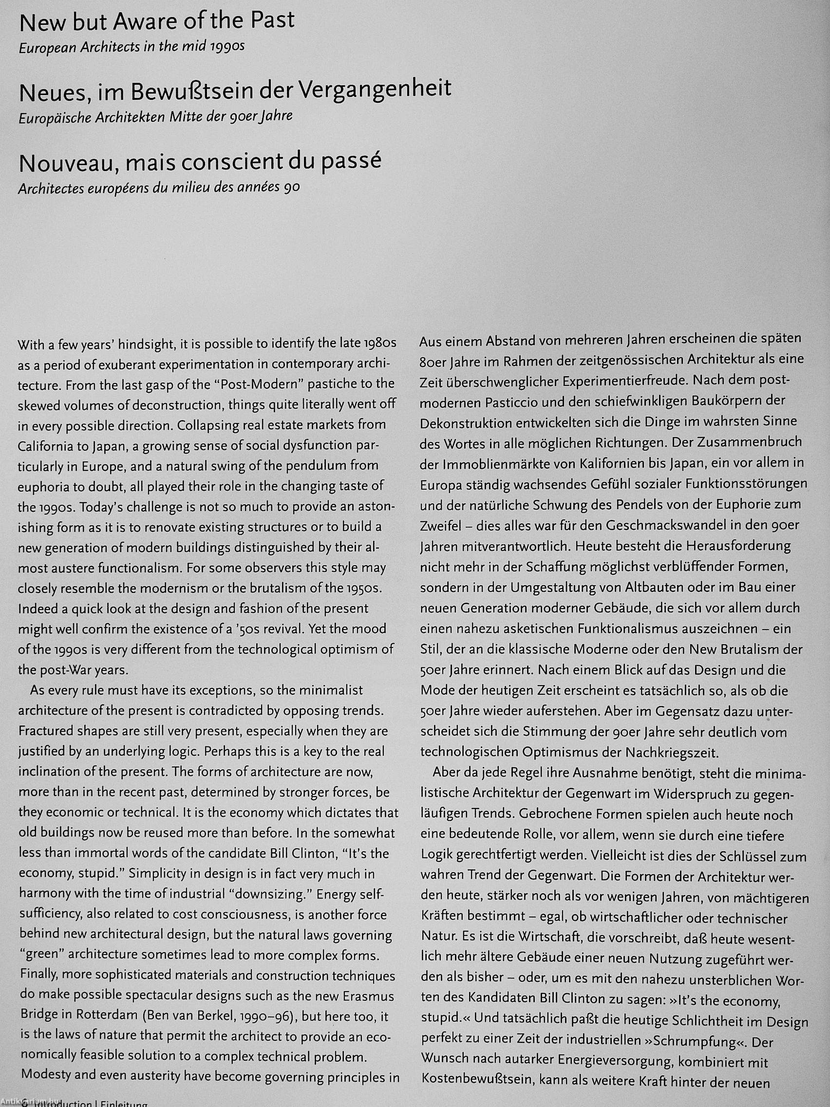 Au milieu des années 1990, l'architecture européenne contemporaine reste fort inventive. Elle s'exprime aussi bien dans les ouvres de maîtres reconnus tels que Sir Norman Foster et Mario Botta, que dans celles de figures bien plus jeunes, mais que le public commence a reconnaître, comme les architectes hollandais Wiel Arets et Ben van Berkel ou encore le Français Rudy Ricciotti. L'esprit du temps se retrouve dans cet éclectisme qui permet la coexistence pacifique de tendances aussi divergentes que l'ouvre déconstructiviste du groupe autrichien Coop Himmelb(l)au avec la rigueur quelque peu austere du néo-modernisme de l'Allemand losef Paul Kleihues, par exemple. D'autres, comme Reichen &. Robert, travaillent en s'inspirant du passé selon des moyens nouveaux, ou sont a la recherche de nouvelles conceptions d'inspiration écologique radicalement nouvelle, comme Thomas Spiegelhalter.