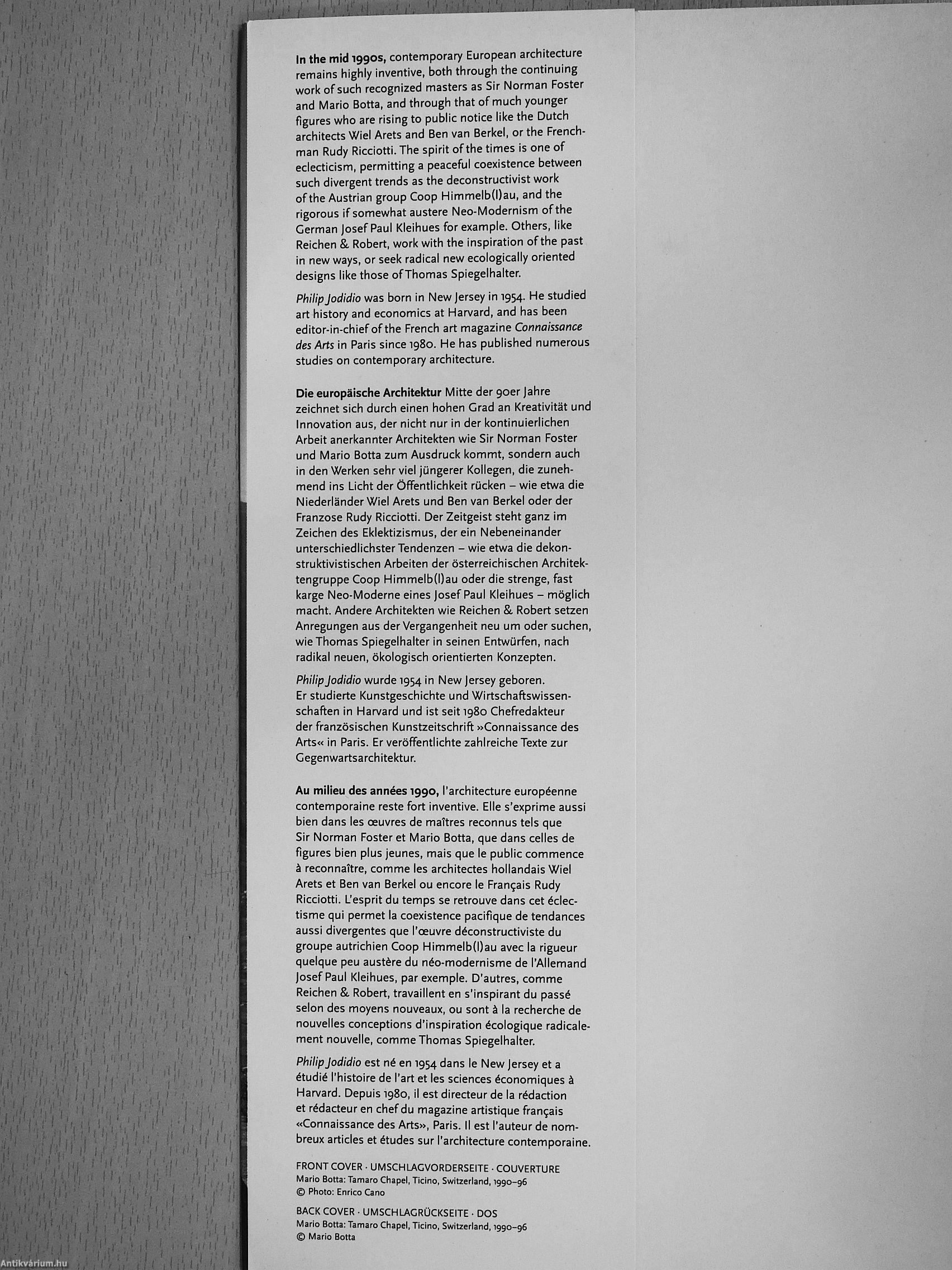 architects Wiel Arets and Ben van Berkel, or the Frenchman Rudy Ricciotti. The spirit of the times is one of eclecticism, permitting a peaceful coexistence between such divergent trends as the deconstructivist work of the Austrian group Coop Himmelb(l)au, and the rigorous if somewhat austere Neo-Modernism of the German Josef Paul Kleihues for example. Others, like Reichen &. Robert, work with the inspiration of the past in new ways, or seek radical new ecologically oriented designs like those of Thomas Spiegelhalter. Philip Jodidio was born in New Jersey in 1954. He studied art history and economics at Harvard, and has been editor-in-chief of the French art magazine Connaissance des Arts in Paris since 1980. He has published numerous...