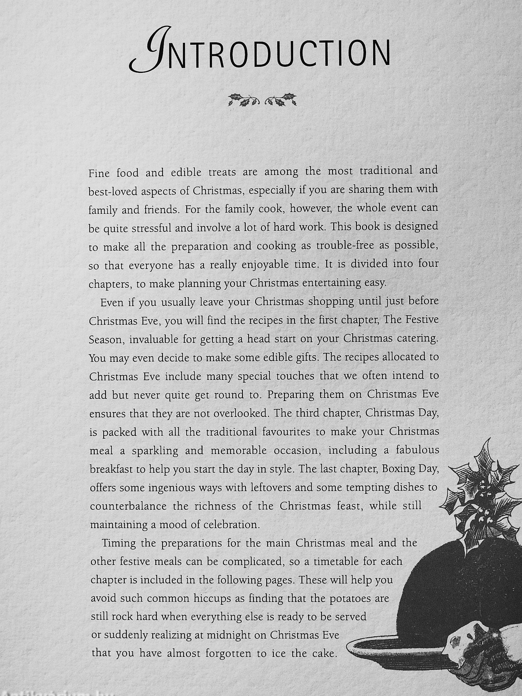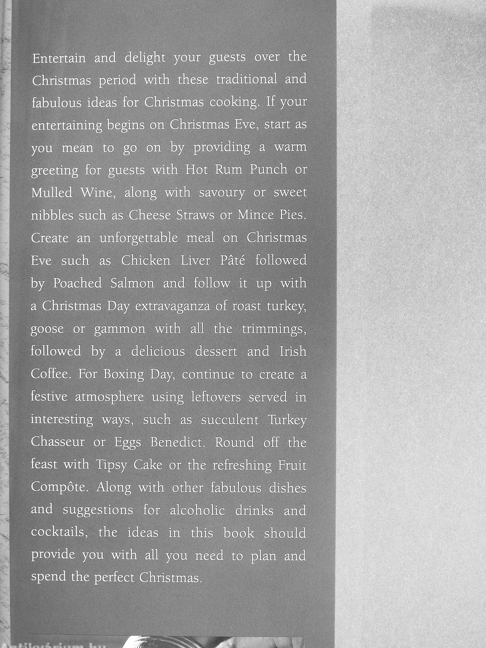 Entertain and delight your guests over the Christmas period with these traditional and fabulous ideas for Christmas cooking. If your entertaining begins on Christmas Eve, start as you mean to go on by providing a warm greeting for guests with Hot Rum Punch or Mulled Wine, along with savoury or sweet nibbles such as Cheese Straws or Mince Pies. Create an unforgettable meal on Christmas Eve such as Chicken Liver Pâté followed by Poached Salmon and follow it up with a Christmas Day extravaganza of roast turkey, goose or gammon with all the trimmings, followed by a delicious dessert and Irish Coffee. For Boxing Day, continue to create a festive atmosphere using leftovers served in interesting ways, such as succulent Turkey Chasseur or Eggs Benedict. Round off the feast with Tipsy Cake or the refreshing Fruit Compote. Along with other fabulous dishes and suggestions for alcohohc drinks and cocktails, the ideas in this book should provide you with all you need to plan and spend the perfect Christmas.
