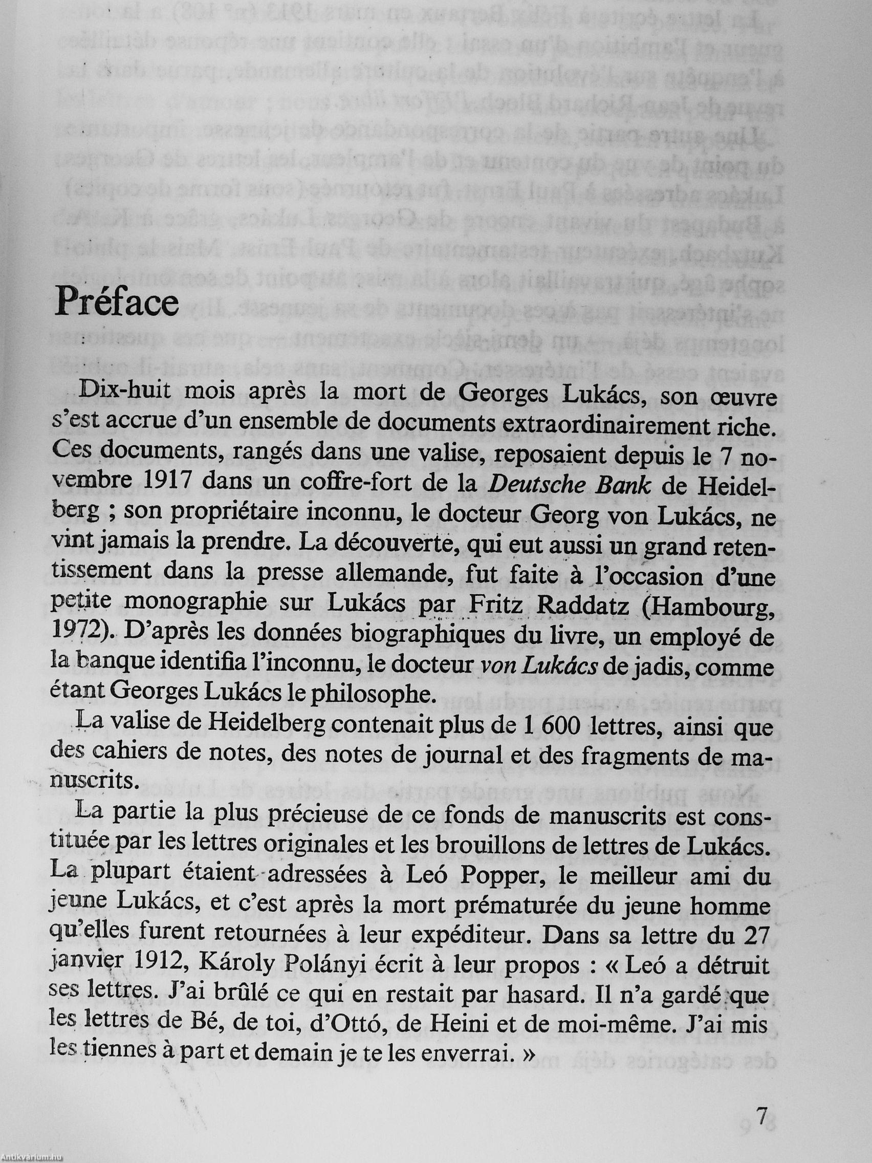 Ce volume donne, en premiere édition française, 140 lettres puisées dans ce fonds tres riche de la correspondance du jeune Lukács que contenait une valise déposée en 1917, et retrouvée naguere dans une banque de Heidelberg.