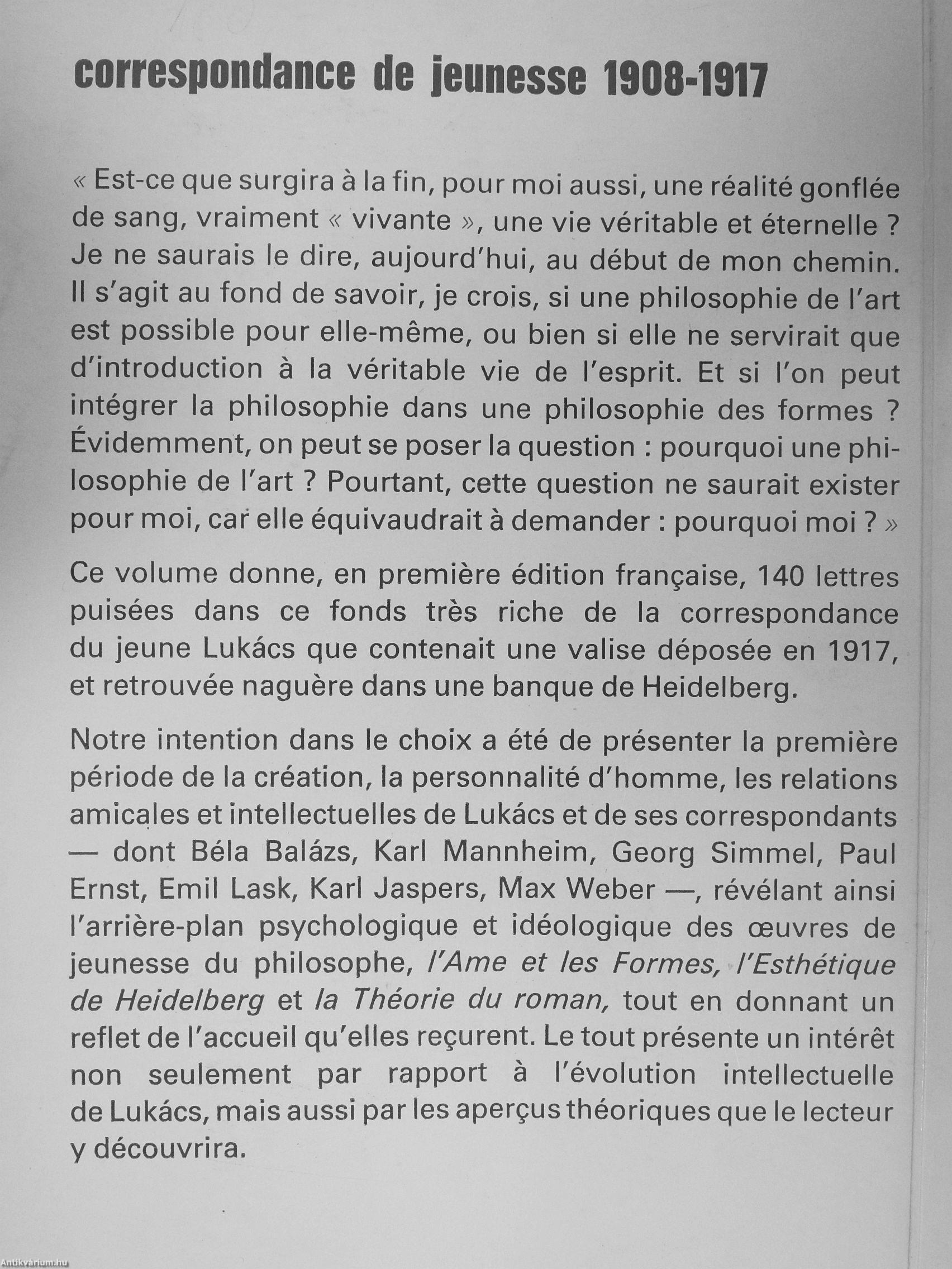 Notre intention dans le choix a été de présenter la premiere période de la création, la personnalité d'homme, les relations amicales et intellectuelles de Lukács et de ses correspondants — dont Béla Balázs, Karl Mannheim, Georg Simmel, Paul Ernst, Emil Lask, Karl Jaspers, Max Weber —, révélant ainsi l'arriere-plan psychologique et idéologique des ouvres de jeunesse du philosophe, l'Ame et les Formes, l'Esthétique de Heidelberg et la Théorie du roman, tout en donnant un reflet de l'accueil qu'elles reçurent. Le tout présente un intéret non seulement par rapport a l'évolution intellectuelle de Lukács, mais aussi par les aperçus théoriques que le lecteur y découvrira.