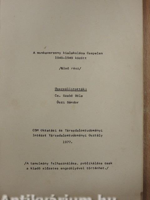 Kiadó: Csepel Vas- és Fémművek Oktatási és Társadalomtudományi Intézet Társadalomtudományi Osztály