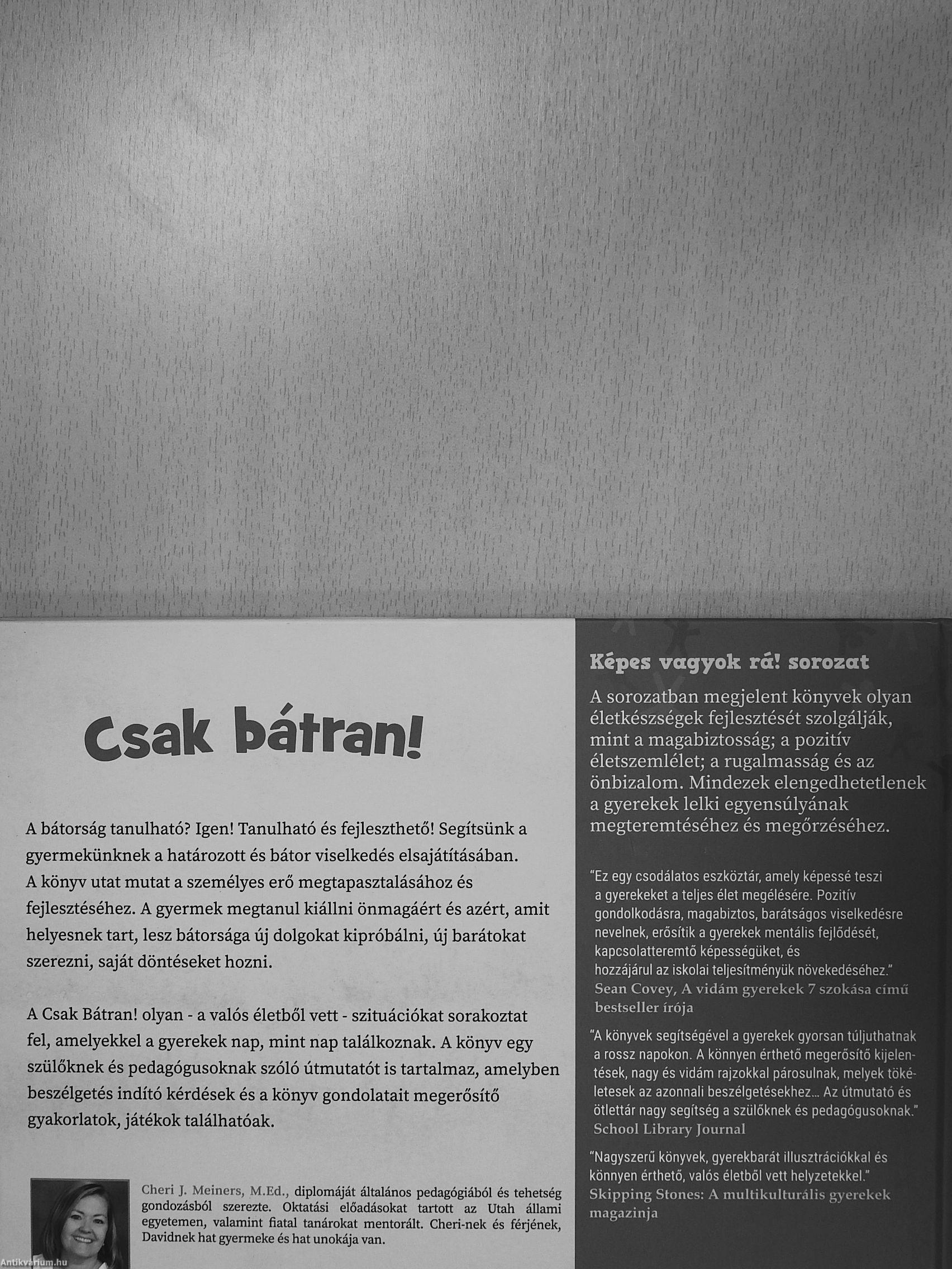 A bátorság tanulható? Igen! Tanulható és fejleszthető! Segítsünk a gyermekünknek a határozott és bátor viselkedés elsajátításában. A könyv utat mutat a személyes erő megtapasztalásához és fejlesztéséhez. A gyermek megtanul kiállni önmagáért és azért, amit helyesnek tart, lesz bátorsága új dolgokat kipróbálni, új barátokat szerezni, saját döntéseket hozni.