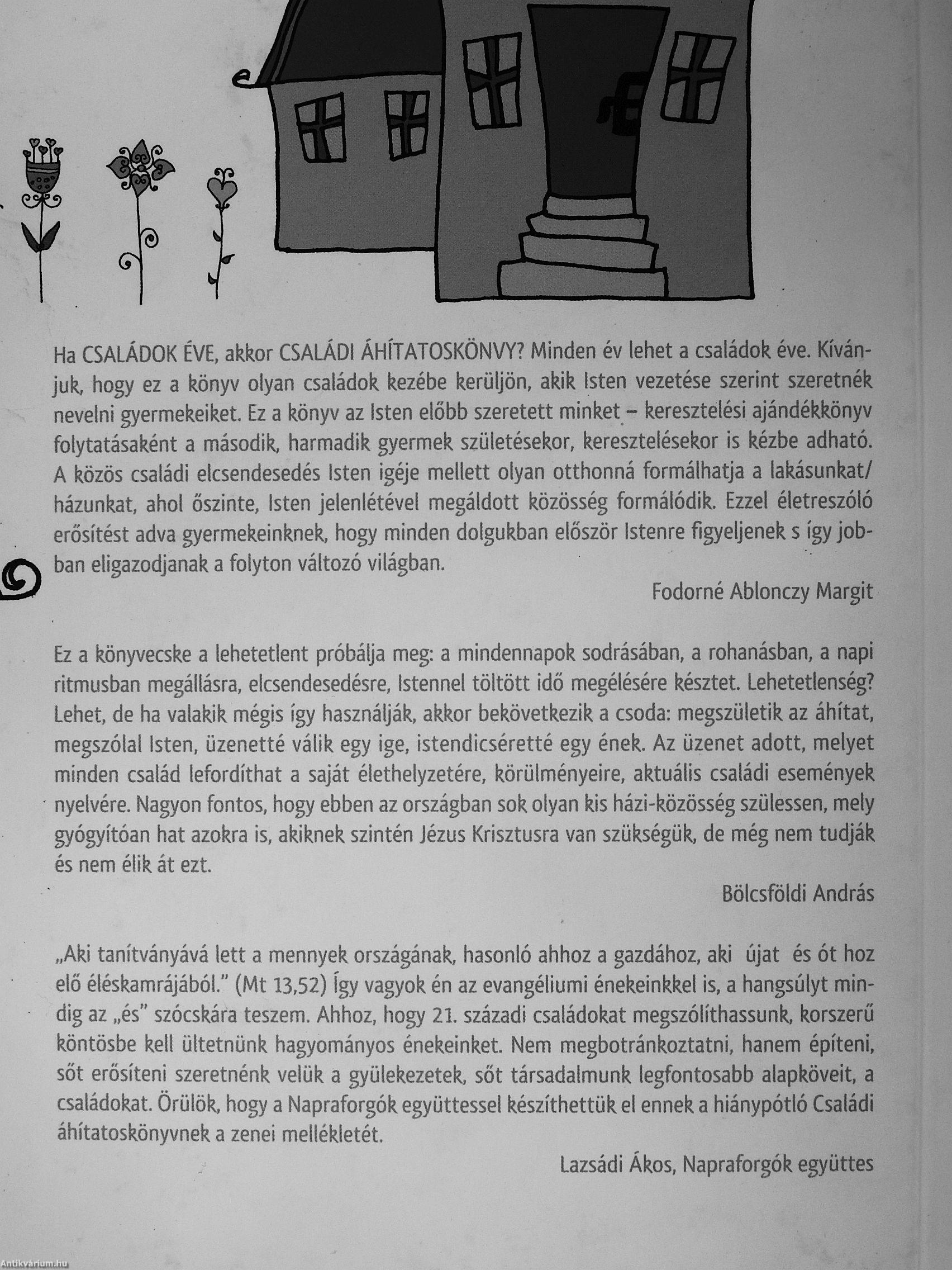 Ez a könyvecske a lehetetlent próbálja meg: a mindennapok sodrásában, a rohanásban, a napi ritmusban megállásra, elcsendesedésre. Istennel töltött idő megélésére késztet. Lehetetlenség? Lehet, de ha valakik mégis így használják, akkor bekövetkezik a csoda: megszületik az áhítat, megszólal Isten, üzenetté válik egy ige, istendicséretté egy ének. Az üzenet adott, melyet minden család lefordíthat a saját élethelyzetére, körülményeire, aktuális családi események nyelvére. Nagyon fontos, hogy ebben az országban sok olyan kis házi-közösség szülessen, mely gyógyítóan hat azokra is, akiknek szintén Jézus Krisztusra van szükségük, de még nem tudják és nem élik át ezt.