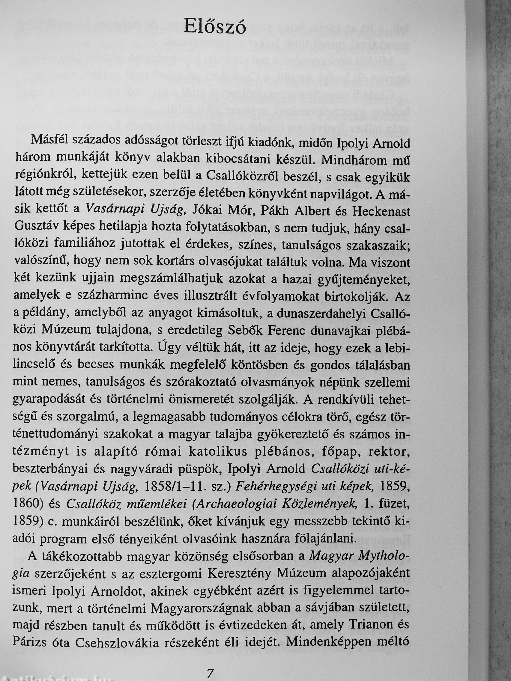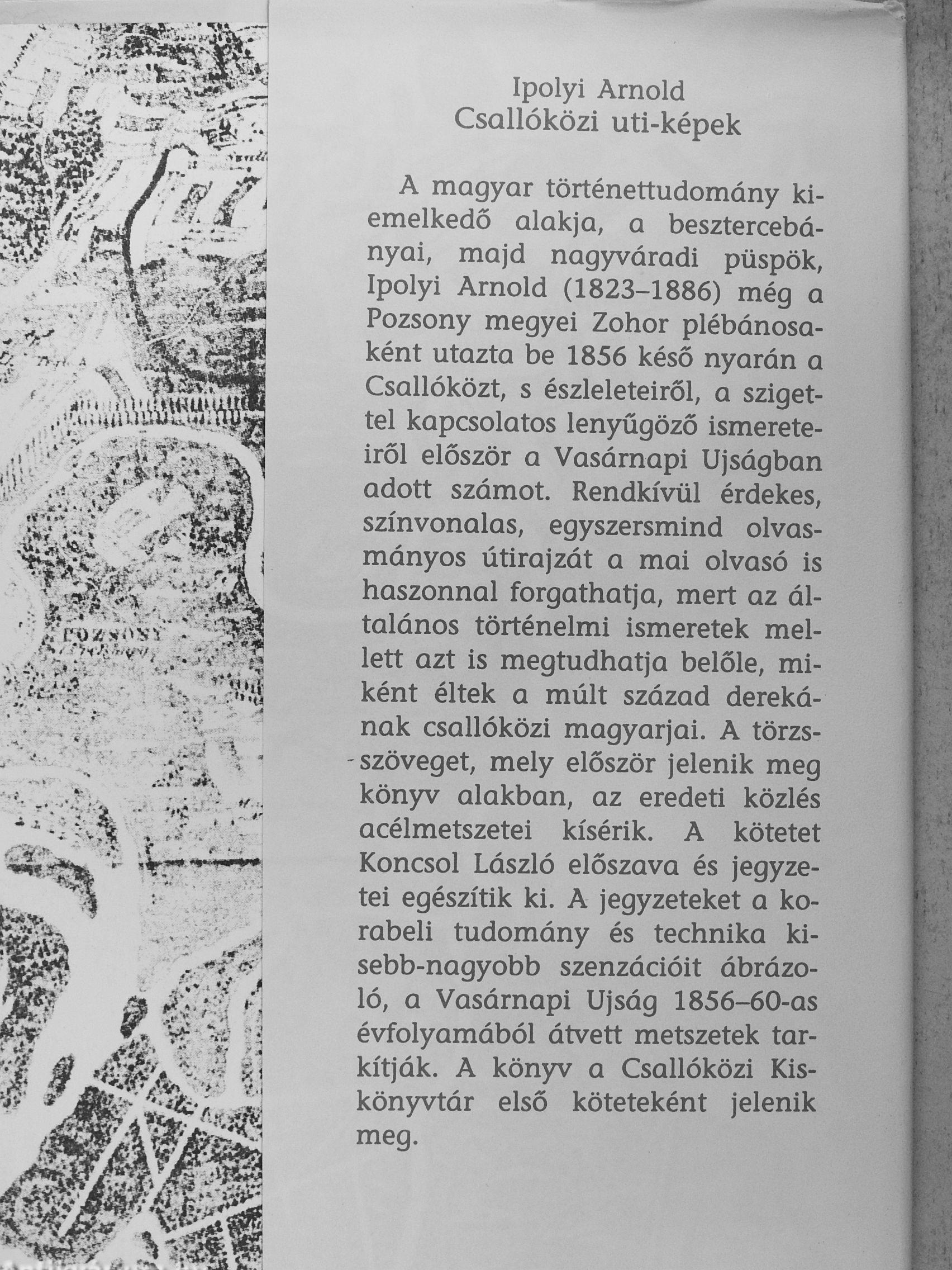 A magyar történettudomány kiemelkedő alakja, a besztercebányai; majd nagyváradi püspök, Ipolyi Arnold (1823-1886) még a Pozsony megyei Zohor plébánosaként utazta be 1856 késő nyarán a Csallóközt, s észleleteiről, a szigettel kapcsolatos lenyűgöző ismereteiről először a Vasárnapi Újságban adott számot. Rendkívül érdekes, színvonalas, egyszersmind olvasmányos útirajzát a mai olvasó is haszonnal forgathatja, mert az általános történelmi ismeretek mellett azt is megtudhatja belőle, miként éltek a múlt század derekának csallóközi magyarjai. A törzsszöveget, mely először jelenik meg könyv alakban, az eredeti közlés acélmetszetei kísérik. A kötetet Koncsol László előszava és jegyzetei egészítik ki. A jegyzeteket a korabeli tudomány és technika kisebb-nagyobb szenzációit ábrázoló, a Vasárnapi Újság 1856-60-as évfolyamából átvett metszetek tarkítják. A könyv a Csallóközi Kiskönyvtár első köteteként jelenik meg.