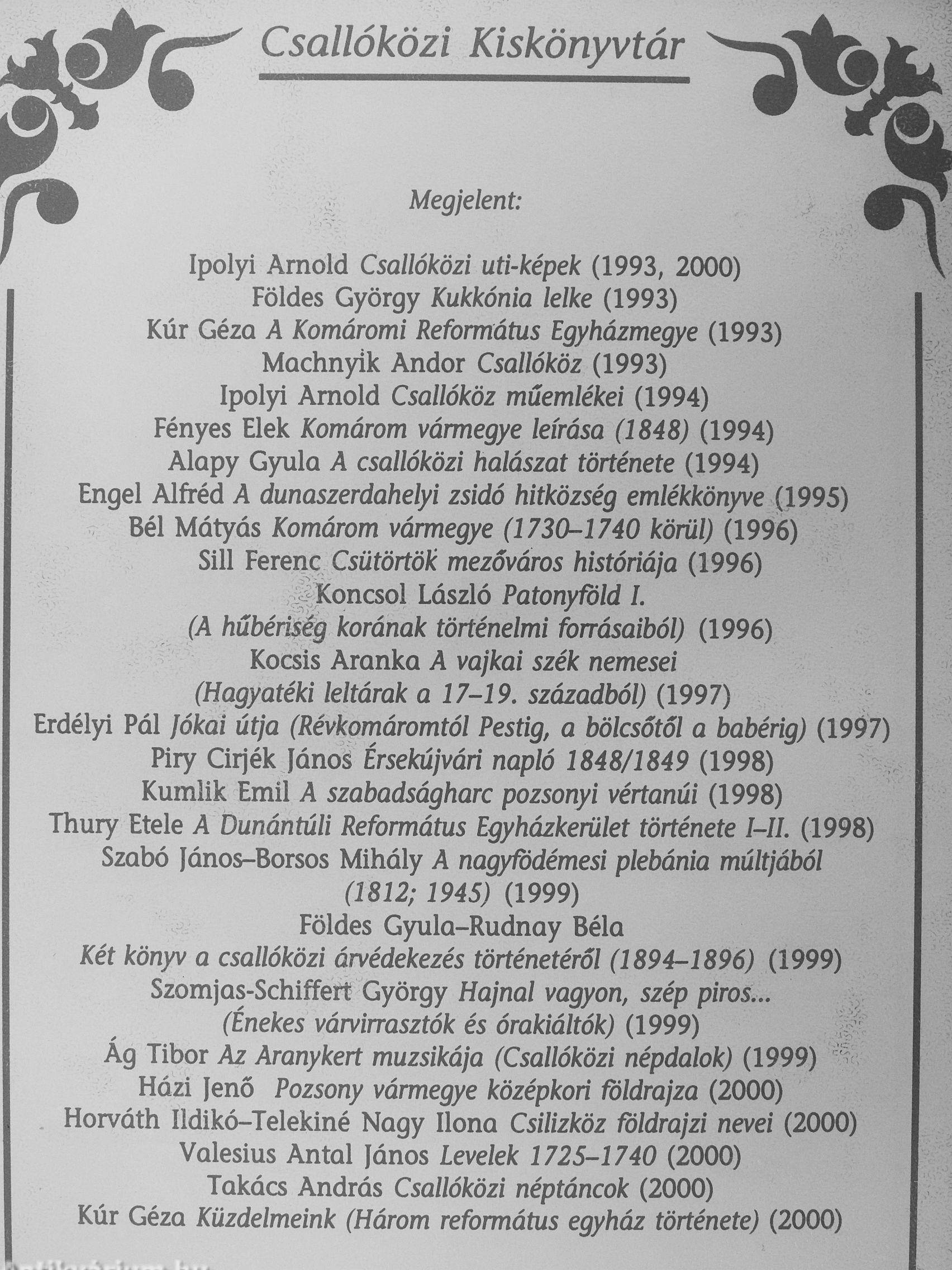 Ipolyi Arnold Csallóközi uti-képek (1993, 2000) Földes György Kukkónia lelke (1993) Kúr Géza A Komáromi Református Egyházmegye (1993) Machnyik Andor Csallóköz (1993) Ipolyi Arnold Csallóköz műemlékei (1994) Fényes Elek Komárom vármegye leírása (1848) (1994) Alapy Gyula A csallóközi halászat története (1994) Engel Alfréd A dunaszerdahelyi zsidó hitközség emlékkönyve (1995) Bél Mátyás Komárom vármegye (1730-1740 körül) (1996) Sill Ferenc Csütörtök mezőváros históriája (1996)