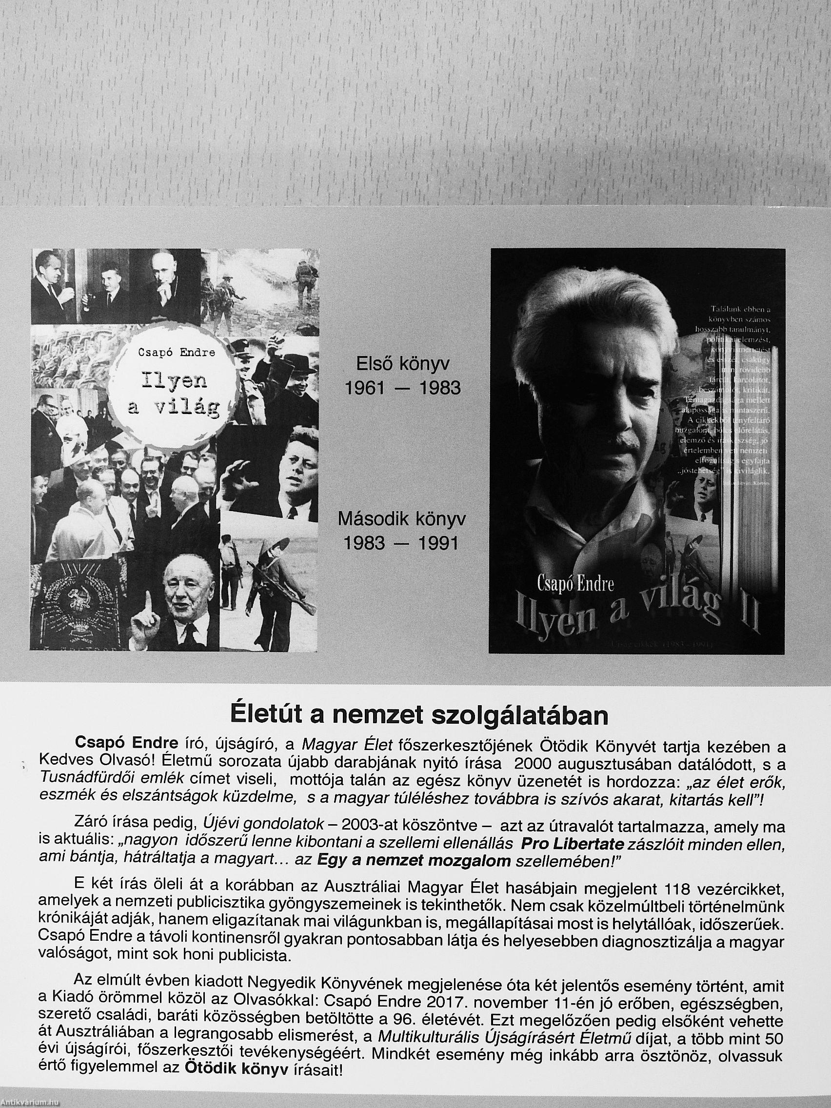 Az elmúlt évben kiadott Negyedik Könyvének megjelenése óta két jelentős esemény történt, amit a Kiadó örömmel közöl az Olvasókkal: Csapó Endre 2017. november 11-én jó erőben, egészségben, szerető családi, baráti közösségben betöltötte a 96. életévét. Ezt megelőzően pedig elsőként vehette át Ausztráliában a legrangosabb elismerést, a iVIultikulturális Újságírásén Életmű díjat, a több mint 50 évi újságírói, főszerkesztői tevékenységéért. Mindkét esemény még inkább arra ösztönöz, olvassuk értő figyelemmel az Ötödik könyv írásait!