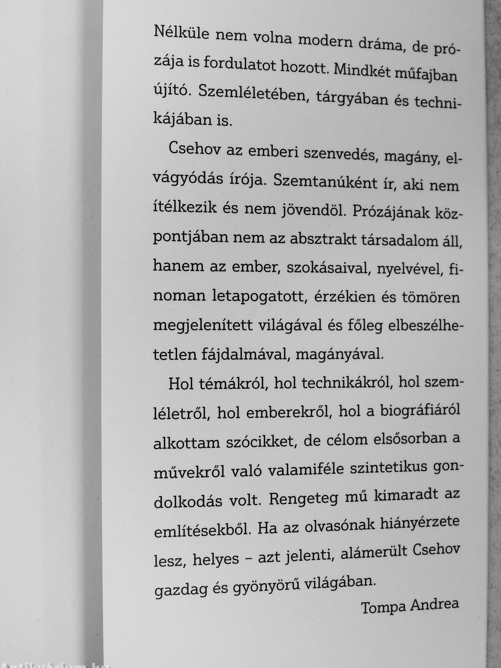 Hol témáiból, hol technikákról, hol szemléletről, hol emberelcről, hol a biográfiáról alkottam szócil<ket, de célom elsősorban a művelőről való valamiféle szintetikus gondolkodás volt. Rengeteg mű lámaradt az említésekből. Ha az olvasónak hiányérzete lesz, helyes - azt jelenti, alámerült Csehov gazdag és gyönyörű világában.