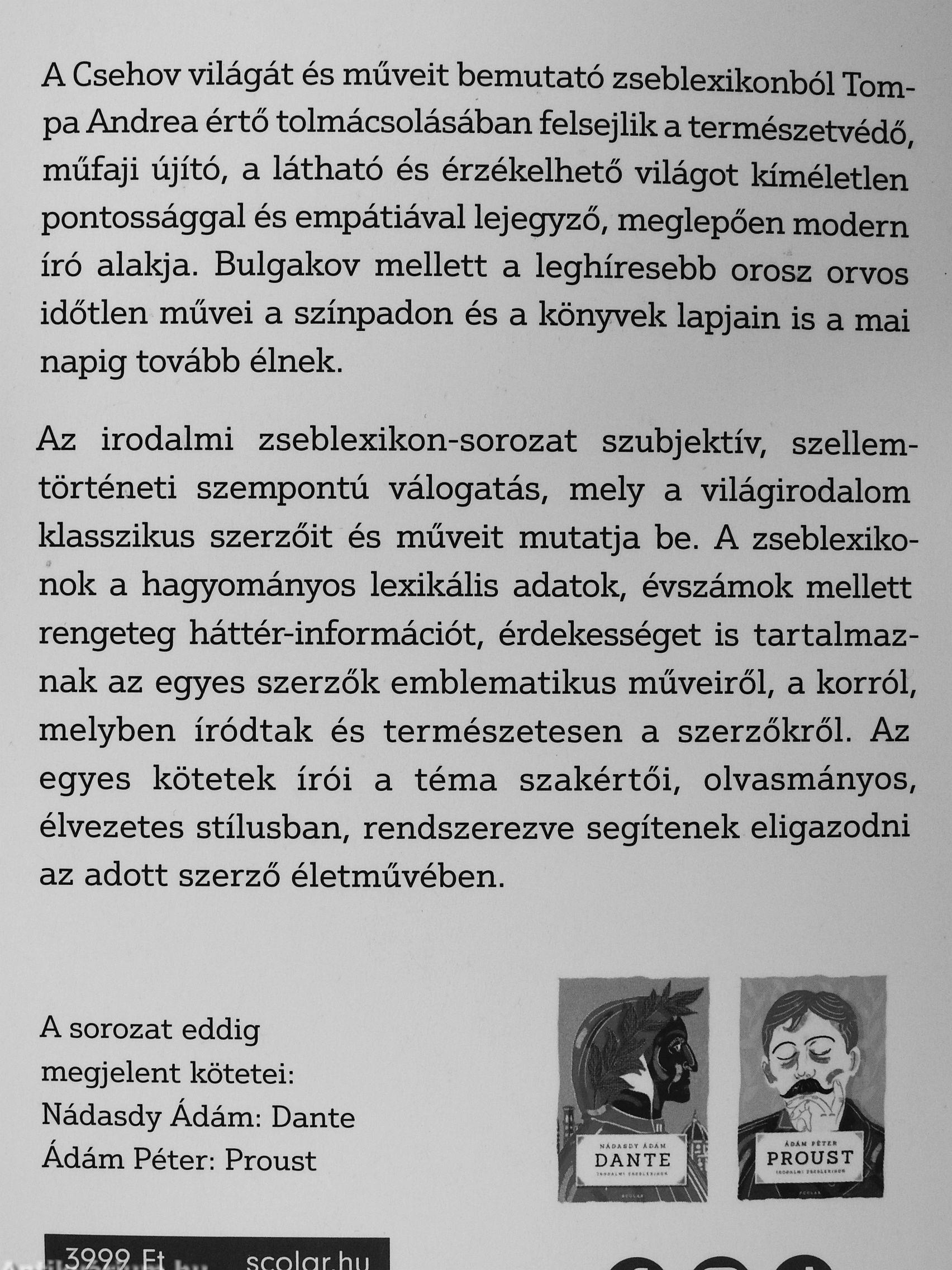 A Csehov világát és műveit bemutató zseblexikonból Tompa Andrea értő tolmácsolásában felsejlik a természetvédő, műfaji újító, a látható és érzékelhető világot Idméletlen pontossággal és empátiával lejegyző, meglepően modern író alakja. Bulgakov mellett a leghíresebb orosz orvos időtlen művei a színpadon és a könyvek lapjain is a mai napig tovább élnek.