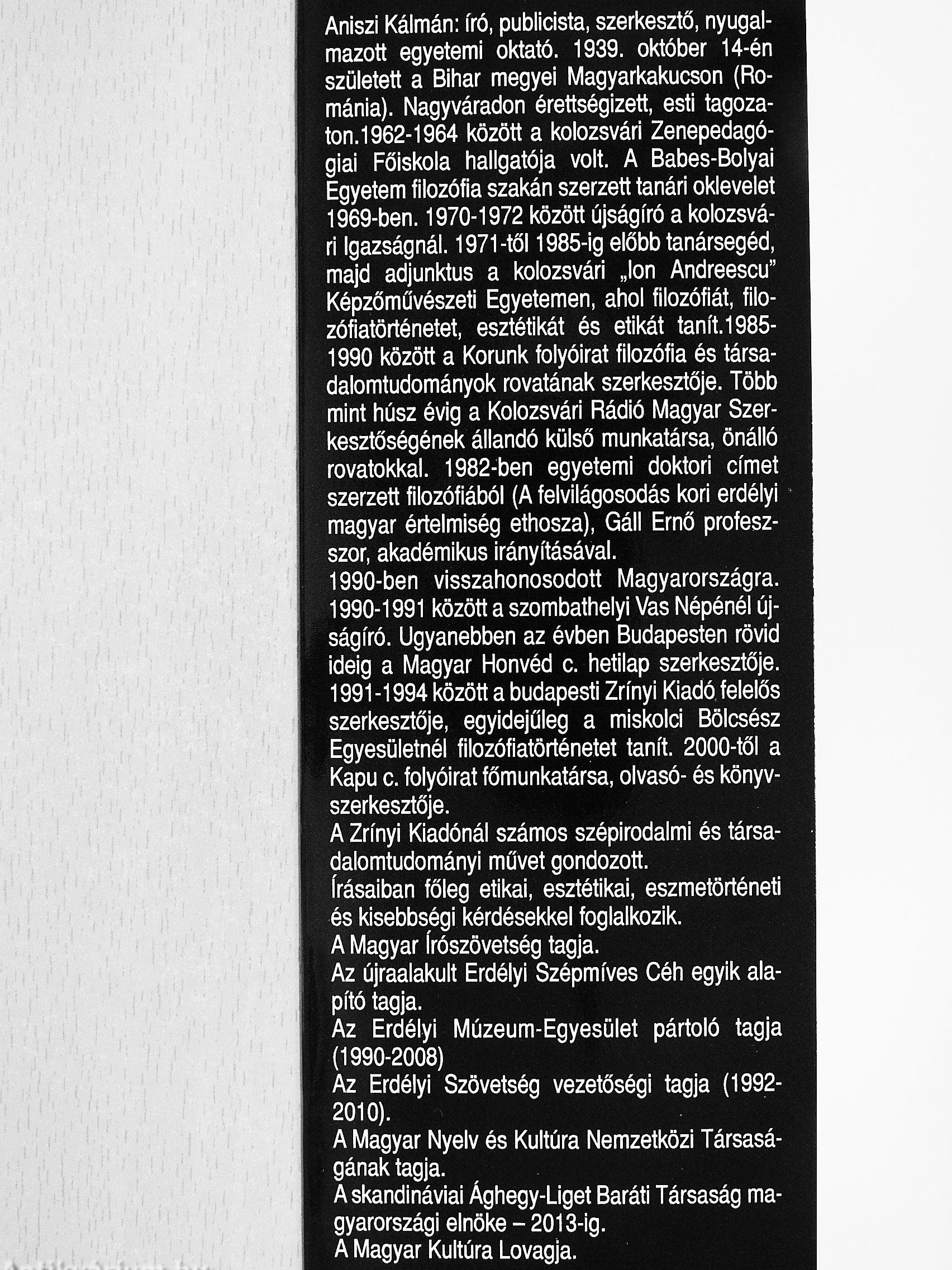 Aniszi Kálmán: író, publicista, szerl<esztő, nyugalmazott egyetemi oktató. 1939. október 14-én született a Bihar megyei Magyarkakucson (Románia). Nagyváradon érettségizett, esti tagoza-ton.1962-1964 között a kolozsvári Zenepedagógiai Főiskola hallgatója volt. A Babes-Bolyai Egyetem filozófia szakán szerzett tanári oklevelet 1969-ben. 1970-1972 között újságíró a kolozsvári Igazságnál. 1971-től 1985-ig előbb tanársegéd, majd adjunktus a kolozsvári „Ion Andreescu" Képzőművészeti Egyetemen, ahol filozófiát, filozófiatörténetet, esztétikát és etikát tanít. 1985-1990 között a Korunk folyóirat filozófia és társadalomtudományok rovatának szerkesztője. Több mint húsz évig a Kolozsvári Rádió Magyar Szerkesztőségének állandó külső munkatársa, önálló rovatokkal. 1982-ben egyetemi doktori címet szerzett filozófiából (A felvilágosodás kori erdélyi magyar értelmiség ethosza), Gáli Ernő profesz-szor, akadémikus irányításával. 1990-ben visszahonosodott Magyarországra.